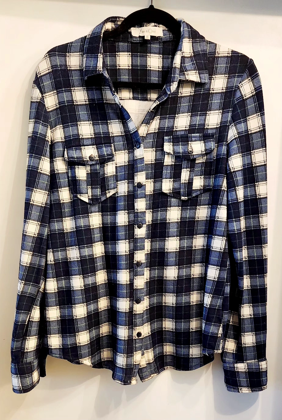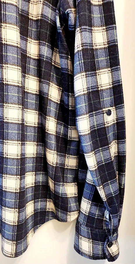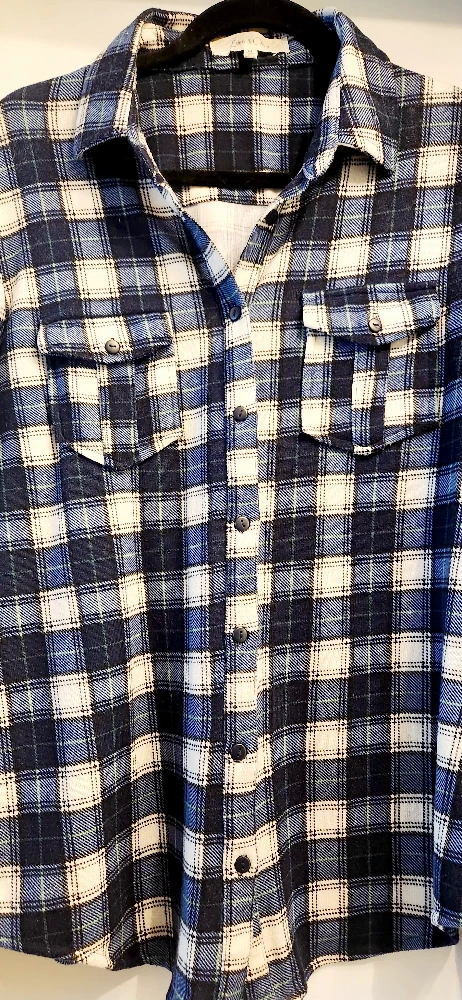 Eden & Olivia long sleeve button-up shirt. Blue, white, and green plaid pattern. Two buttoned chest pockets. Soft flannel material. Relaxed fit with a bit of stretch. Made of 97% polyester and 3% spandex. Sleeves are cuffed and buttoned and can be rolled up and secured with a forearm button and sleeve tie. Great for a comfortable look.