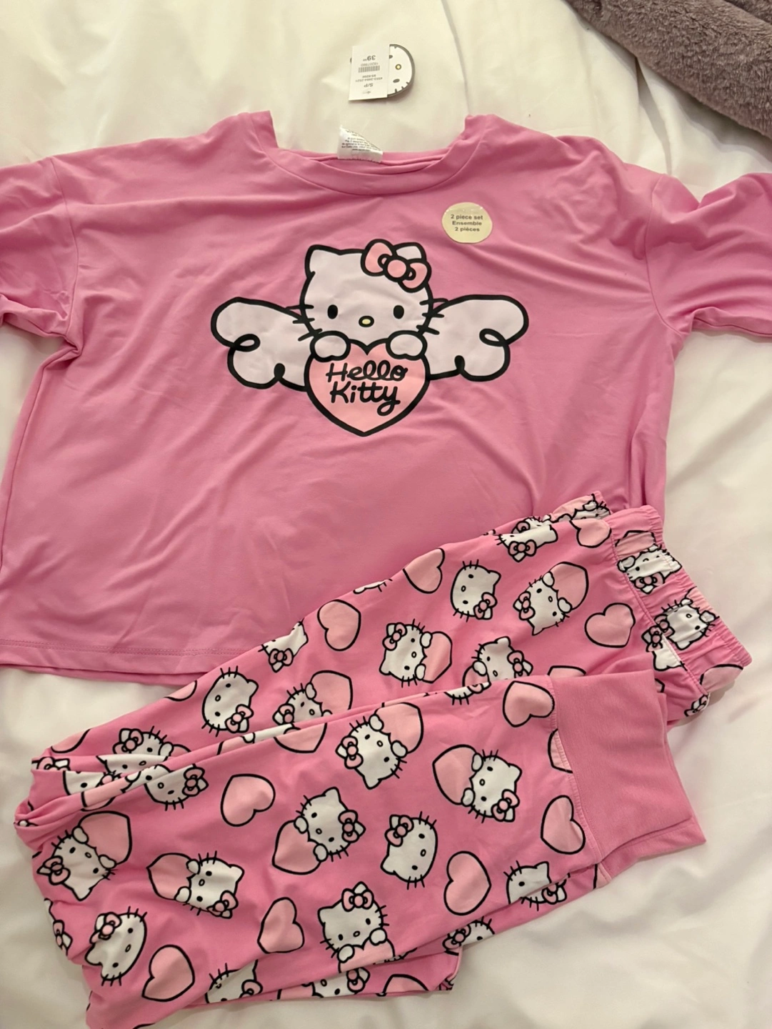 Two-piece pajama sets featuring various Sanrio characters. Includes a short-sleeved top and long pants. Adorable designs perfect for lounging. XS - L