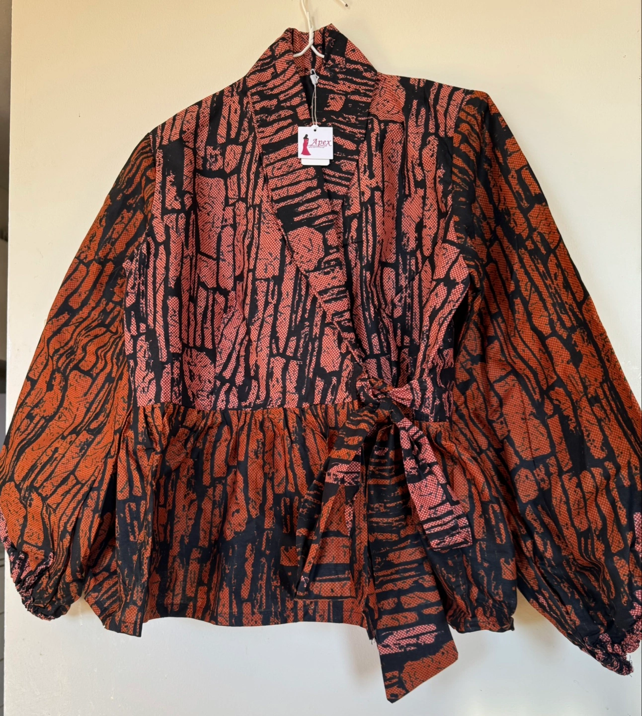 Long-sleeve wrap blouse. Features balloon sleeves and a tie waist. Unique abstract 100% Ankara print. Relaxed fit. Perfect for summer outings.