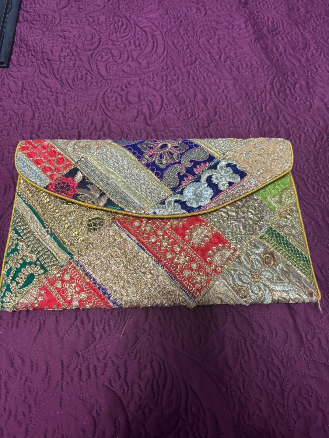 Multicoloured embroidered clutch. Features gold accents and various fabrics. Envelope style closure.