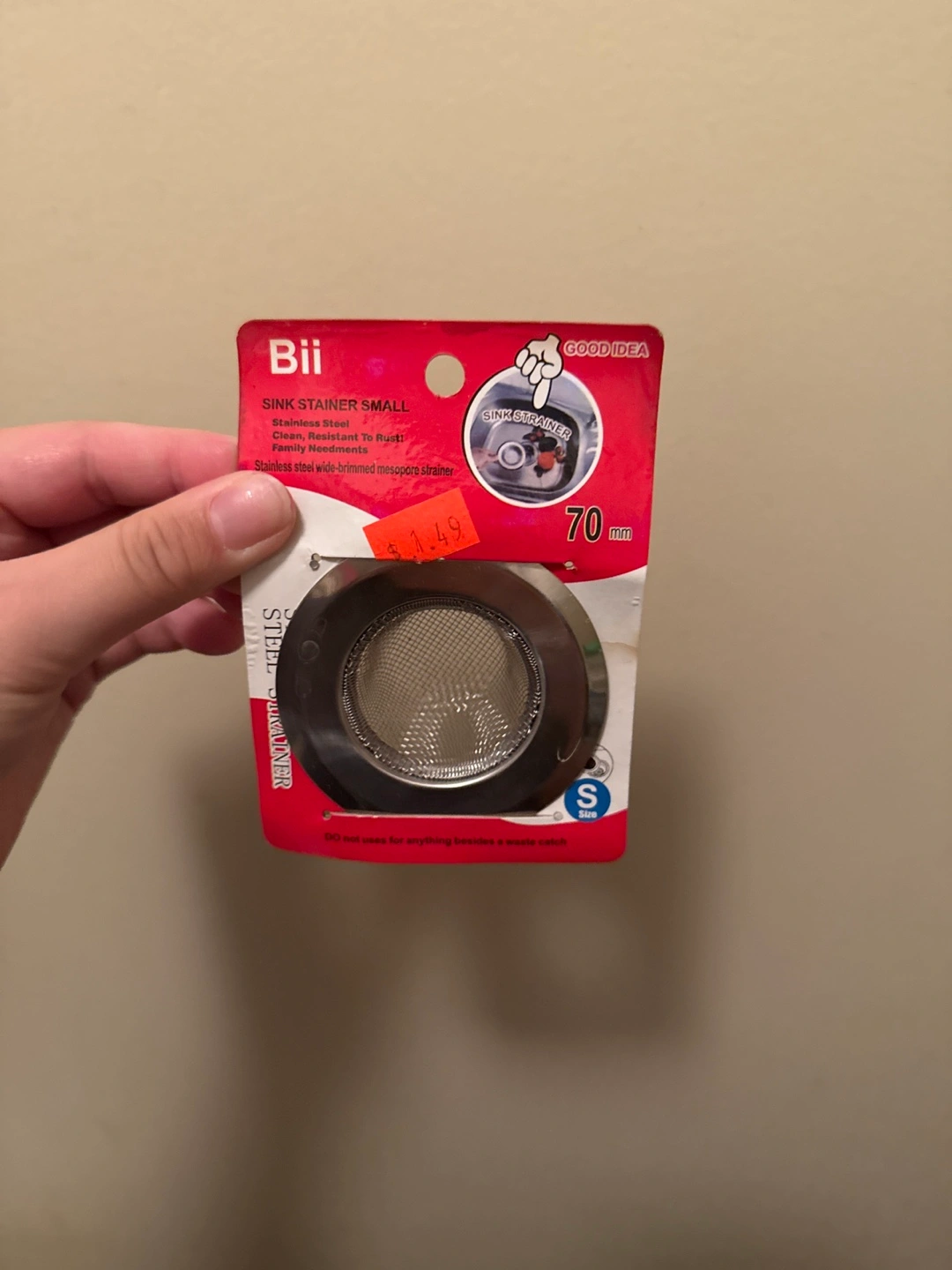 New, small stainless steel sink strainer. 70mm. Clean, rust-resistant. Wide-brimmed. For waste catch only.