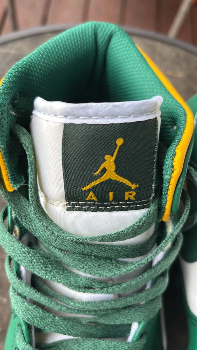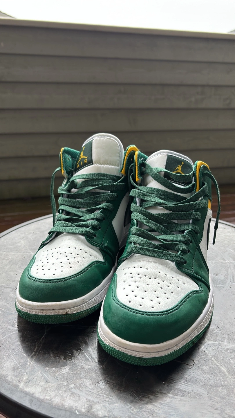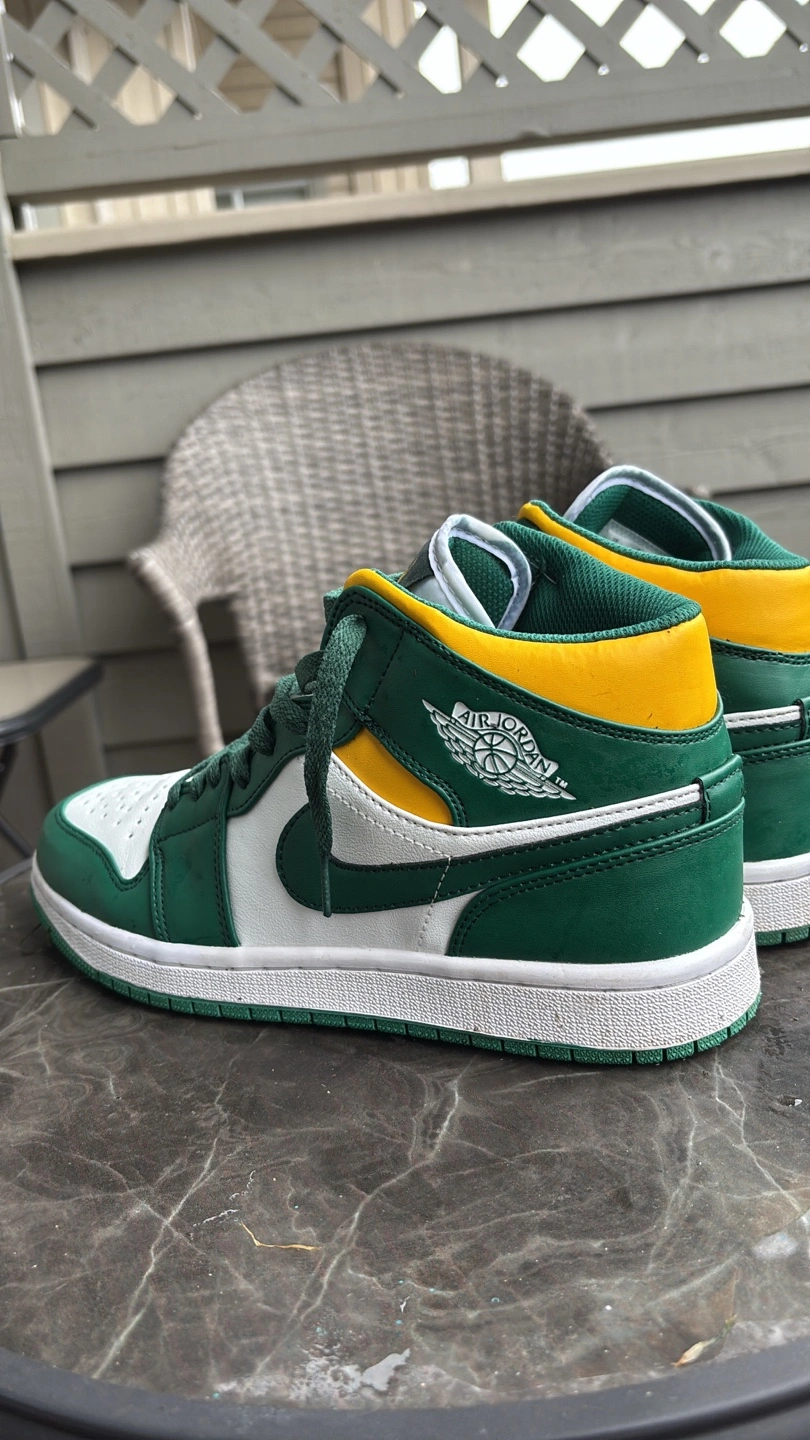 Green and yellow Air Jordan 1 Mid sneakers. Men's size 9.5. Pre-owned, good condition. Classic design, stylish and comfortable.