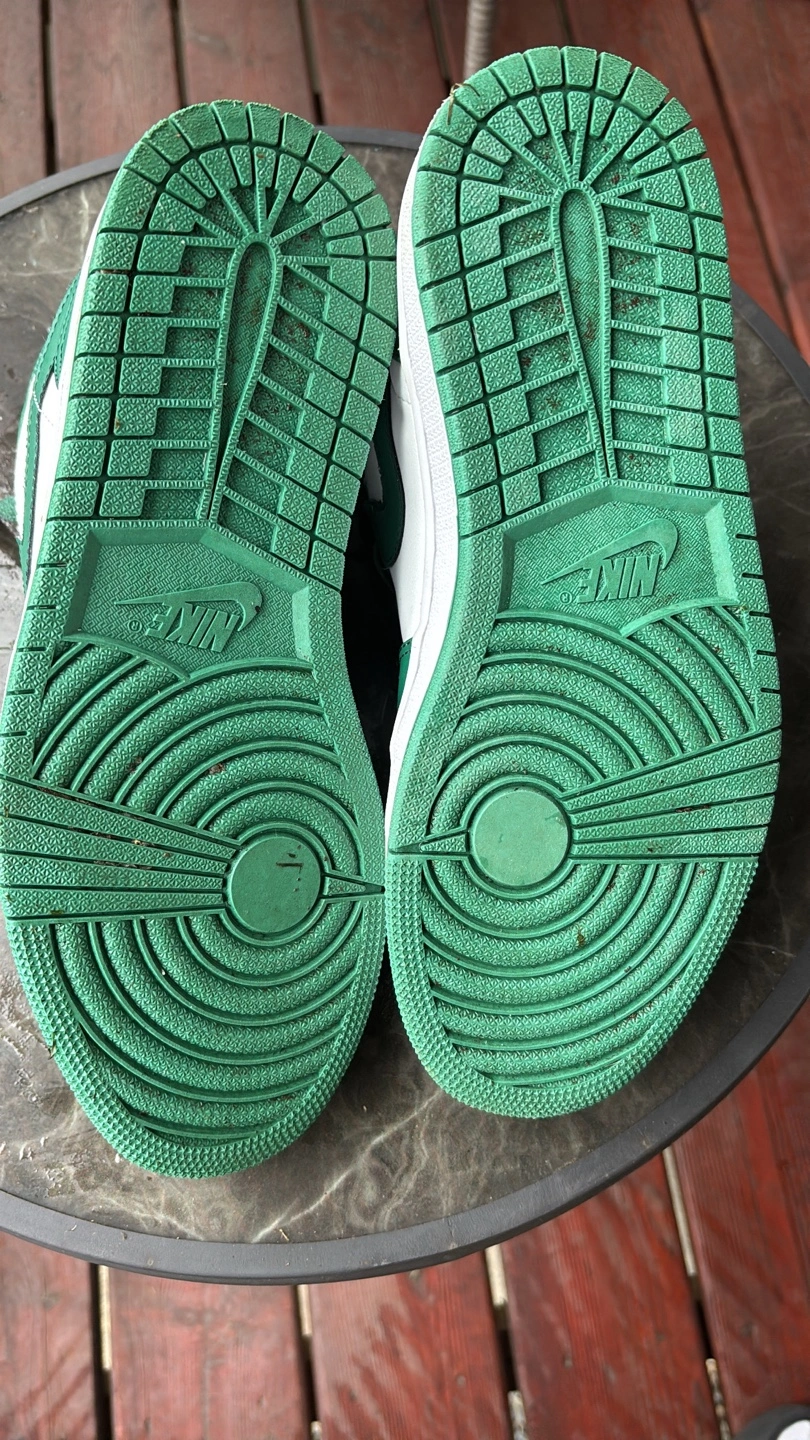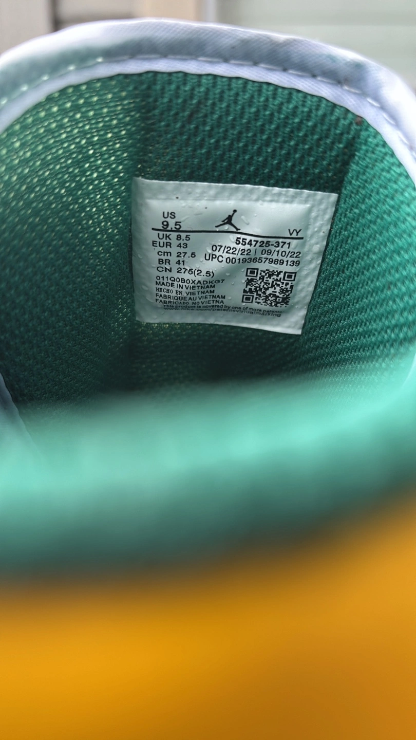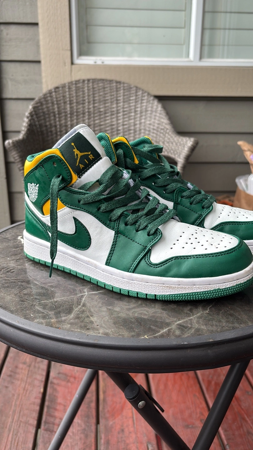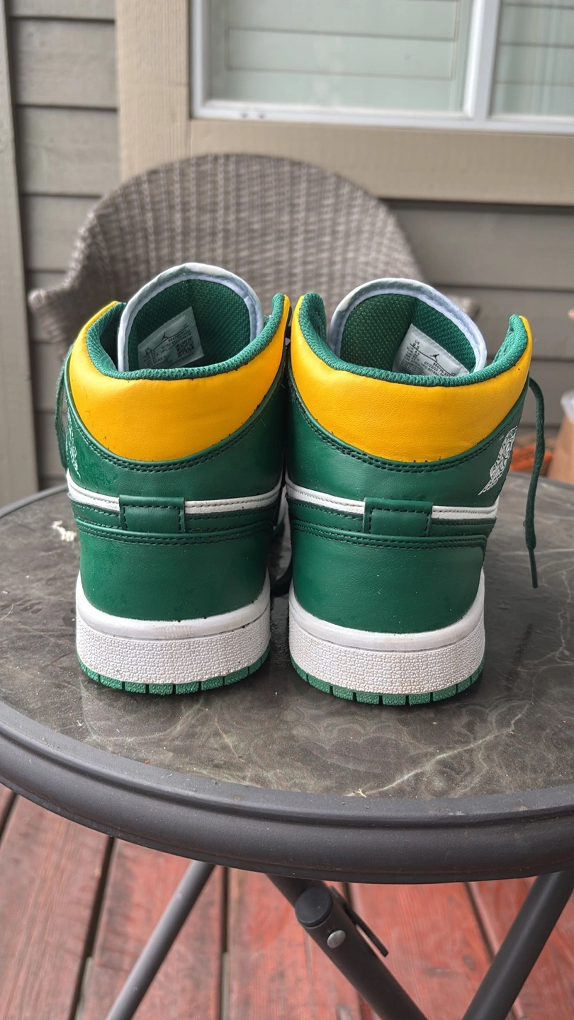Green and yellow Air Jordan 1 Mid sneakers. Men's size 9.5. Pre-owned, good condition. Classic design, stylish and comfortable.