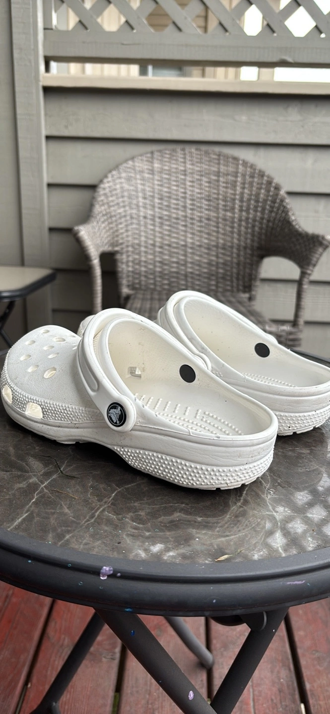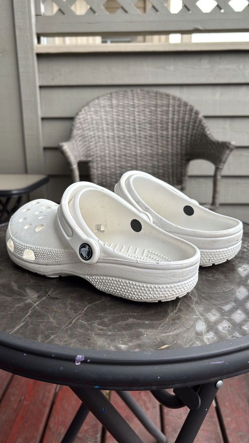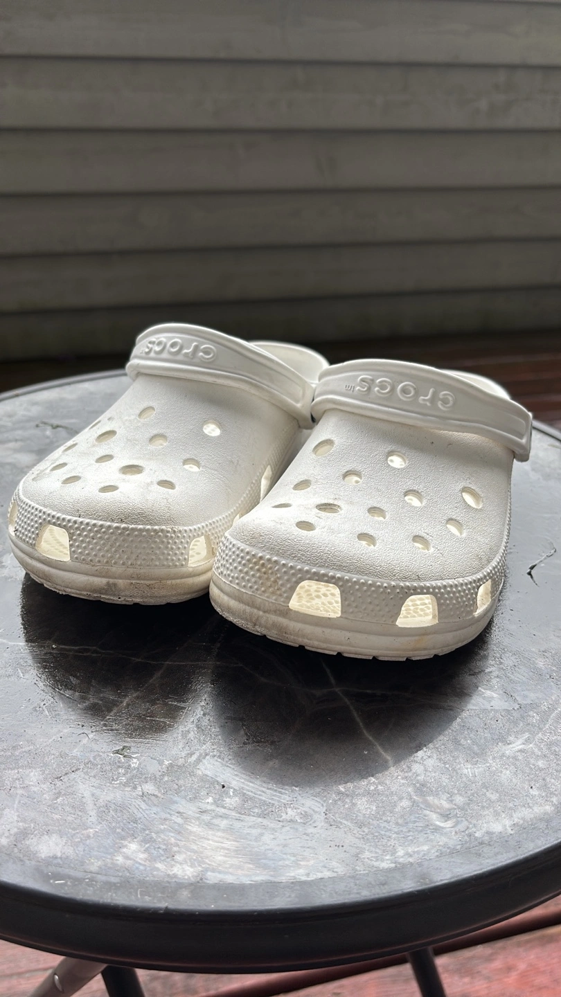Pre-owned women's Crocs Classic Clogs. White colour. Classic Crocs style. Holes throughout. Comfortable and easy to wear.