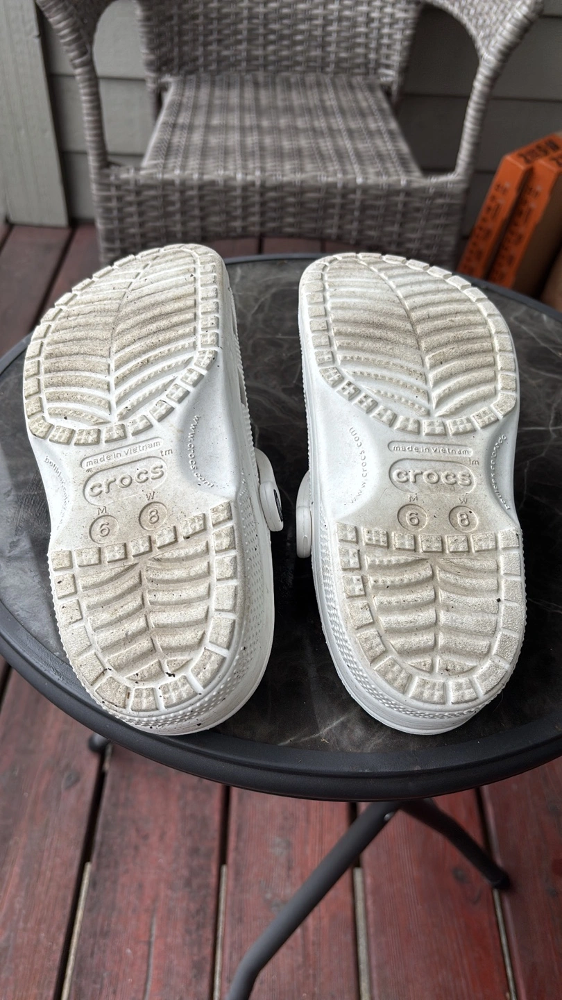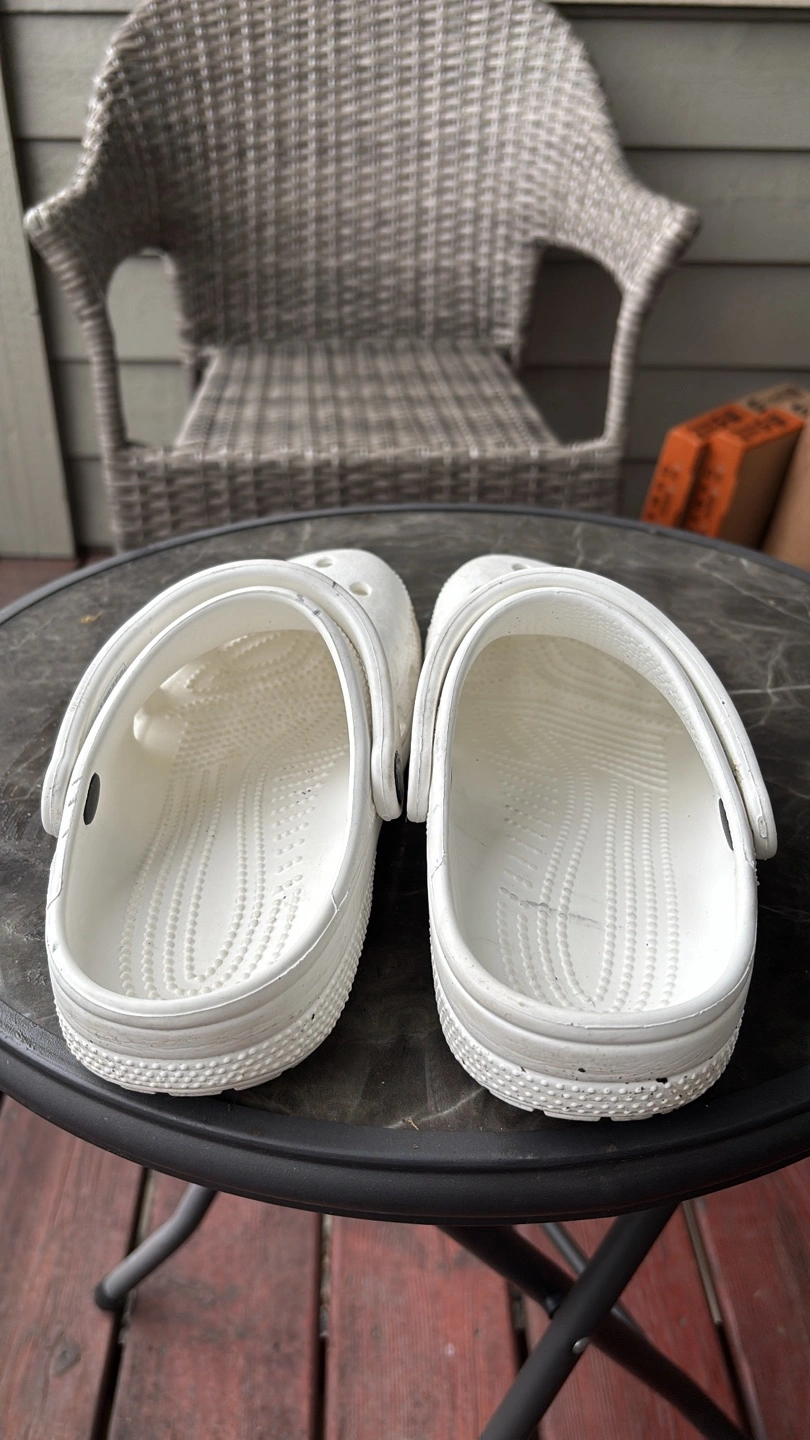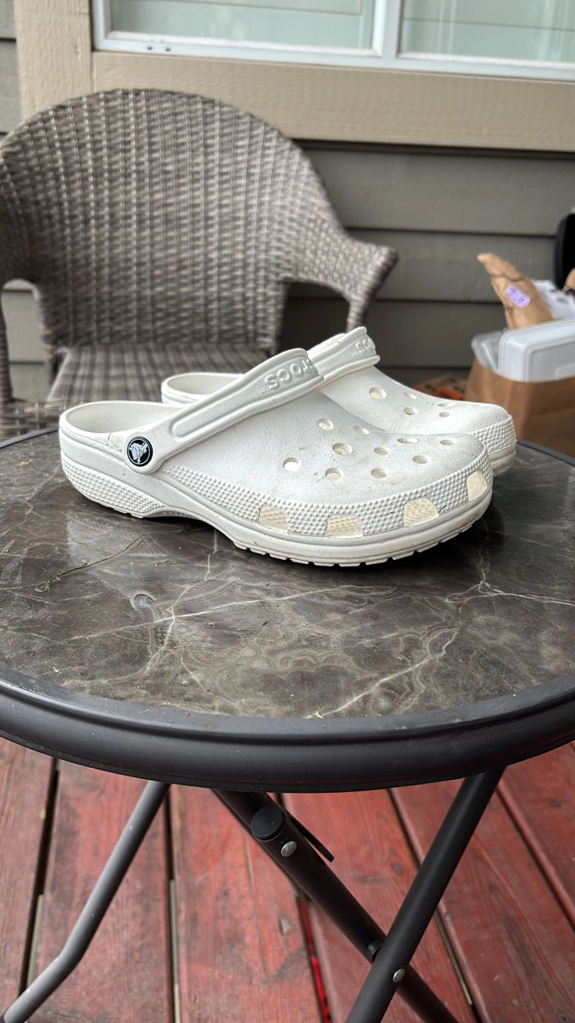 Pre-owned women's Crocs Classic Clogs. White colour. Classic Crocs style. Holes throughout. Comfortable and easy to wear.