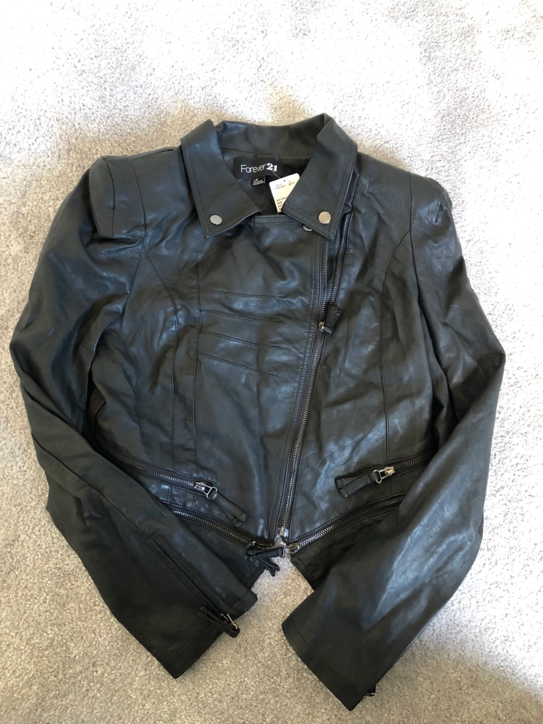 Brand new with tags, Black faux leather jacket. Asymmetrical zipper. Size large. Multiple zipper details. Priority to quickest pick up in Innisfil (Belleaire shores subdivision), TIA