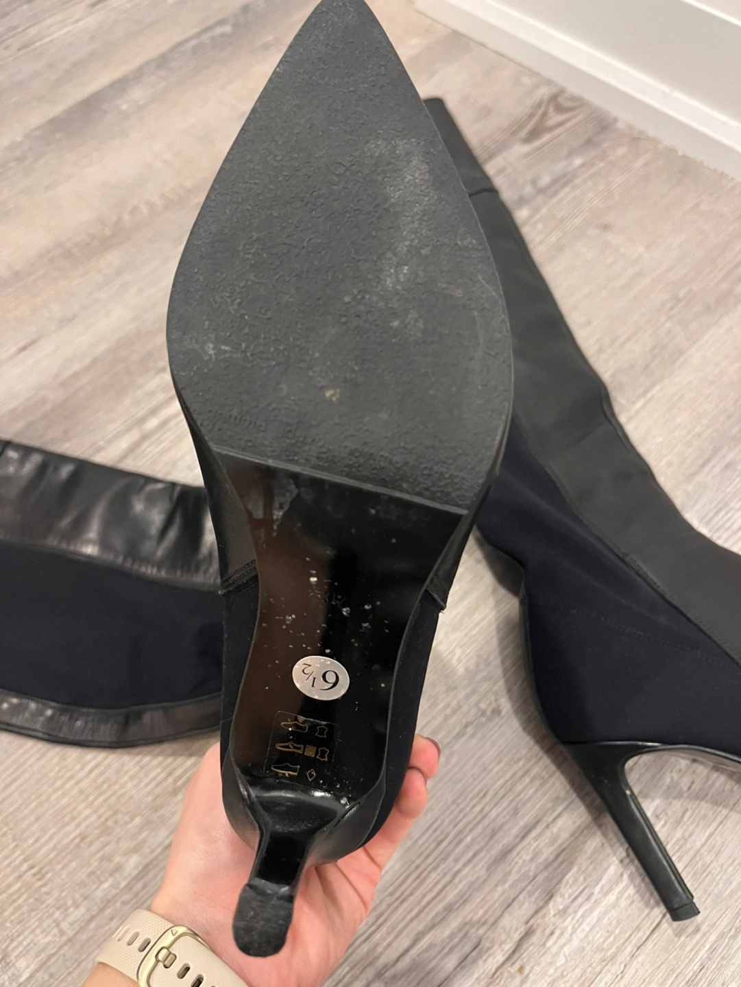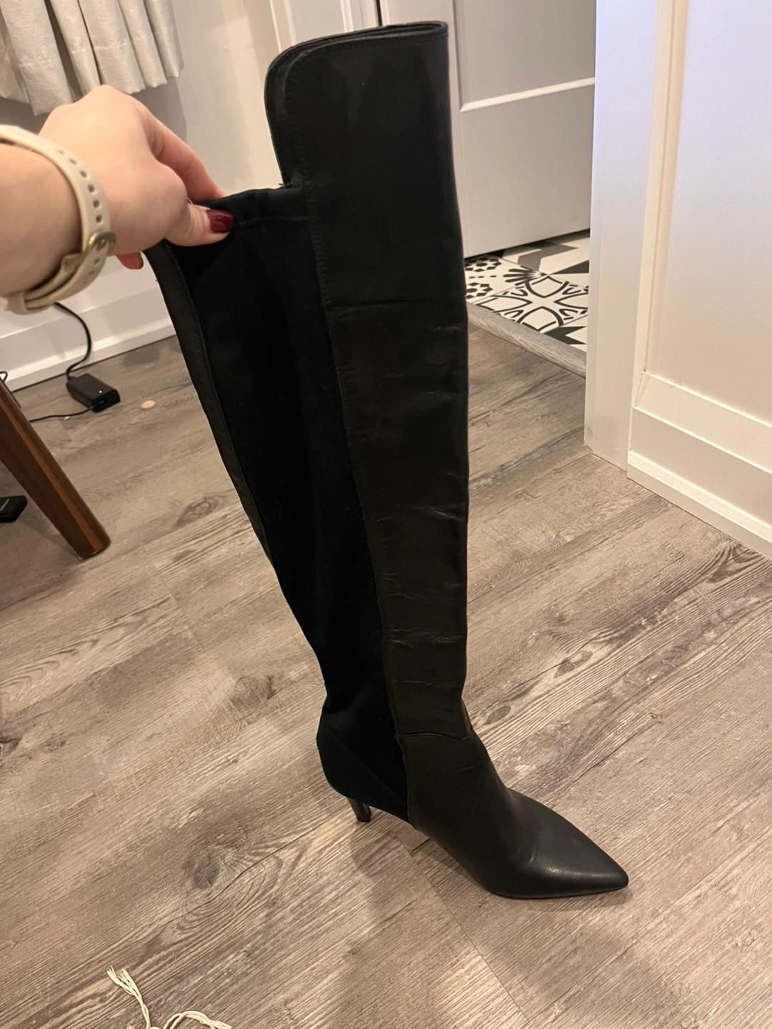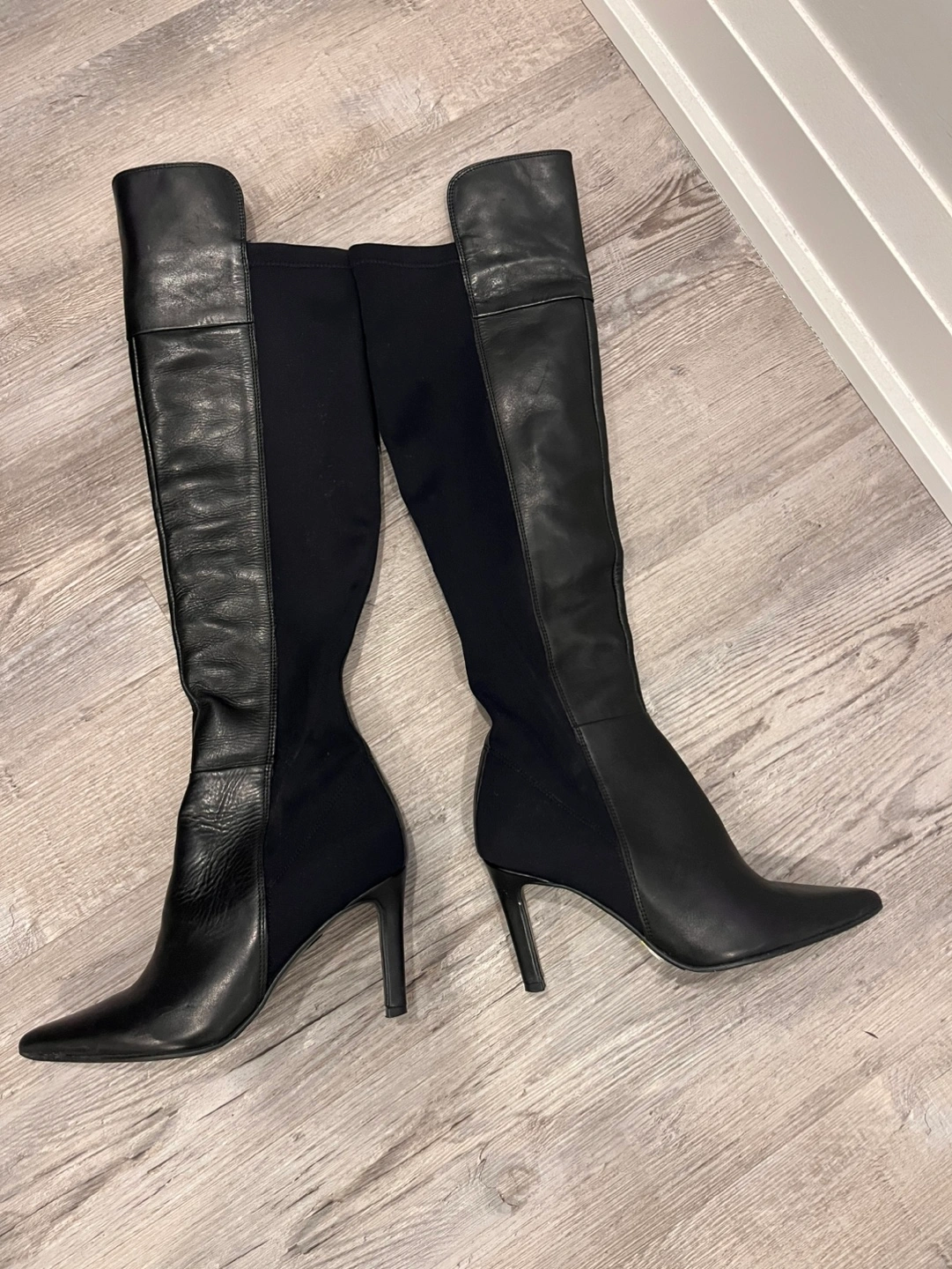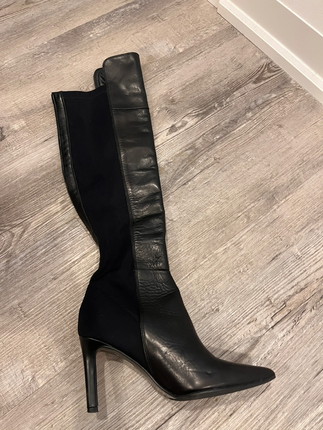 Pair of black over-the-knee boots. Leather and stretch fabric upper. Pointed-toe design. Slight heel 4 inches. Size 6 1/2.