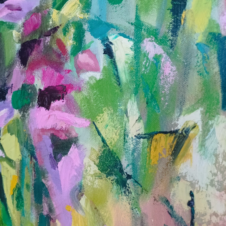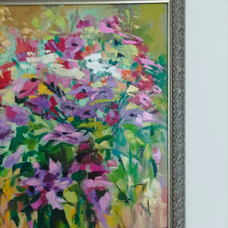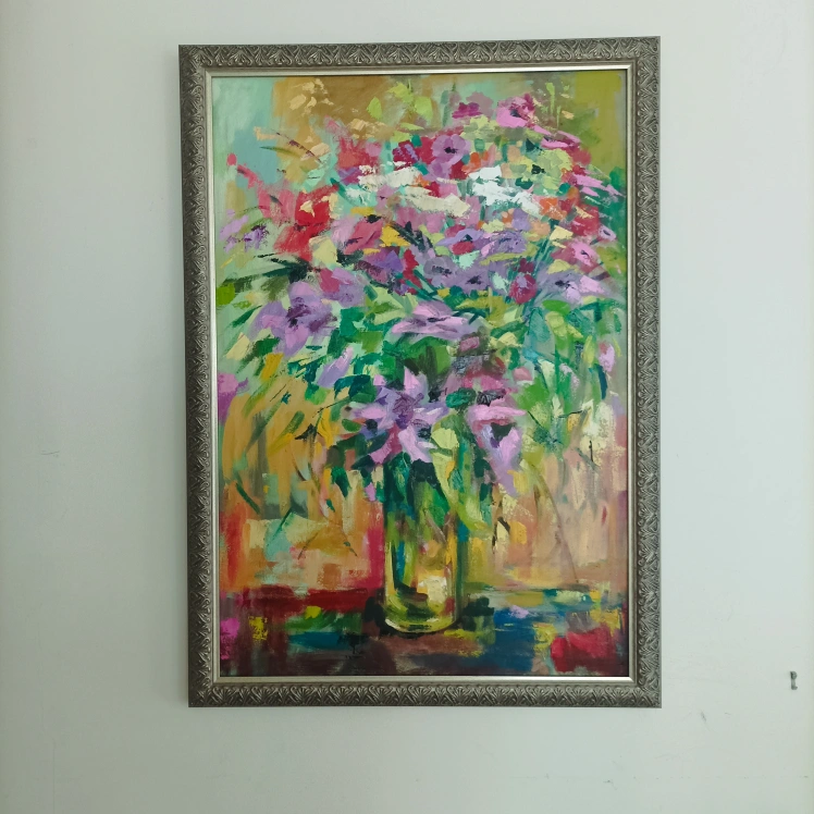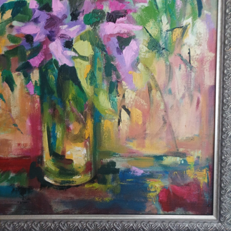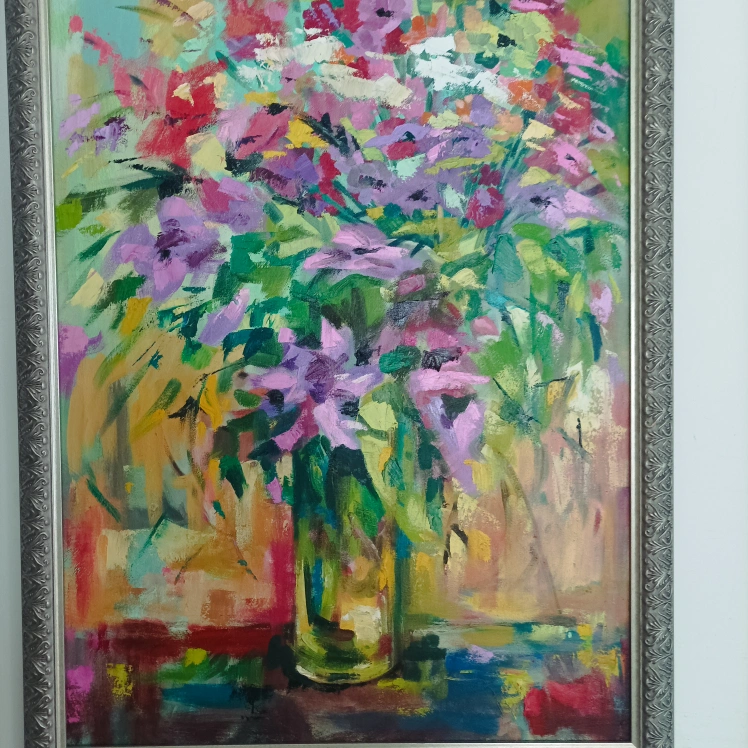 Large colourful oil painting. Depicts a bouquet of flowers in a vase. Features expressive brushstrokes. Framed in a silver-toned ornate frame.37" by 27" with frame