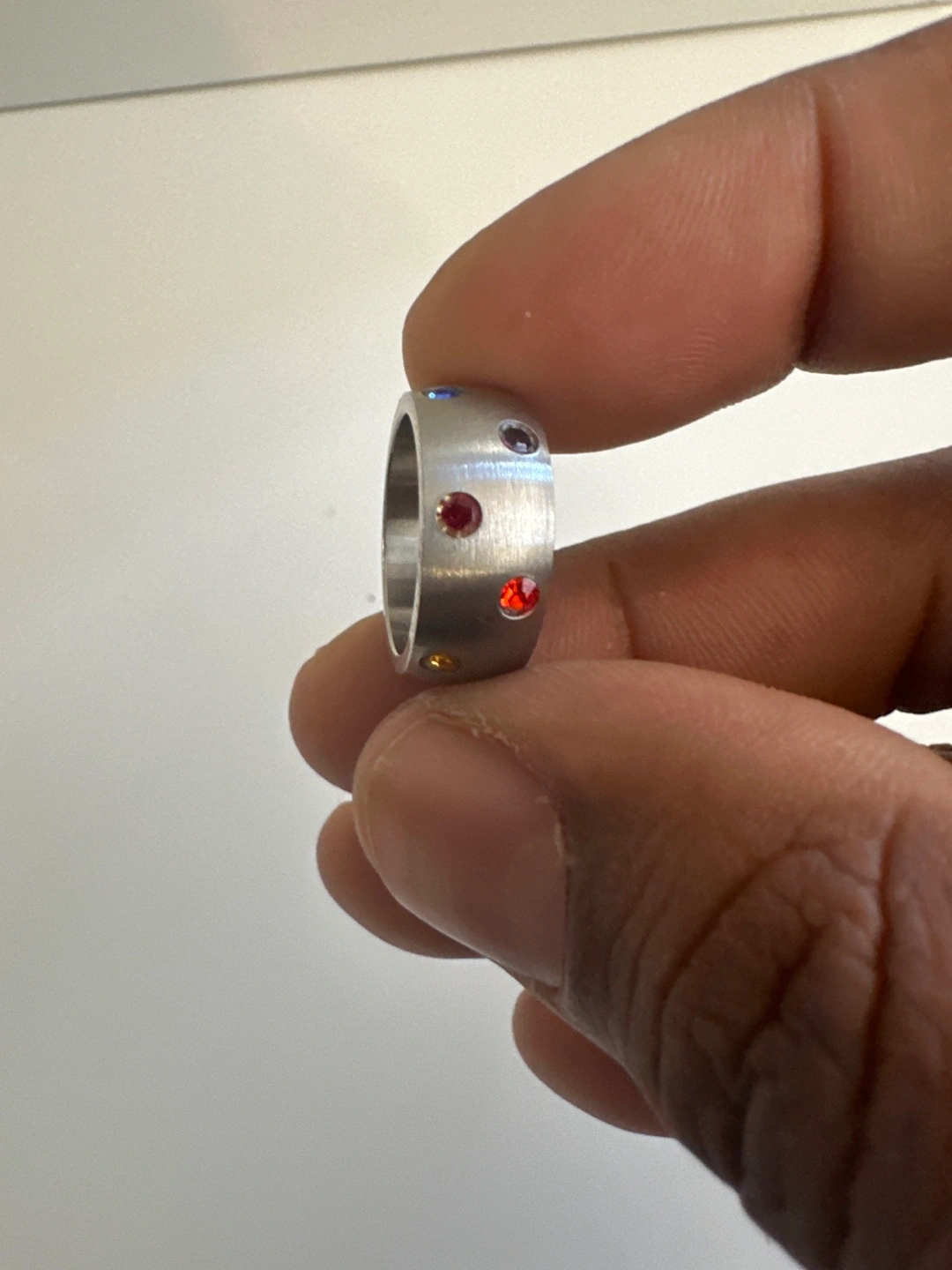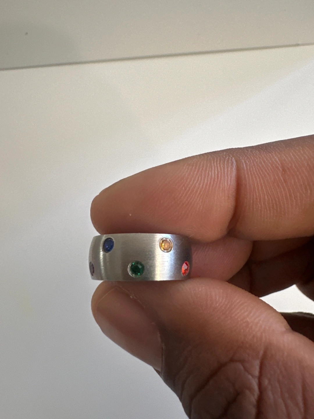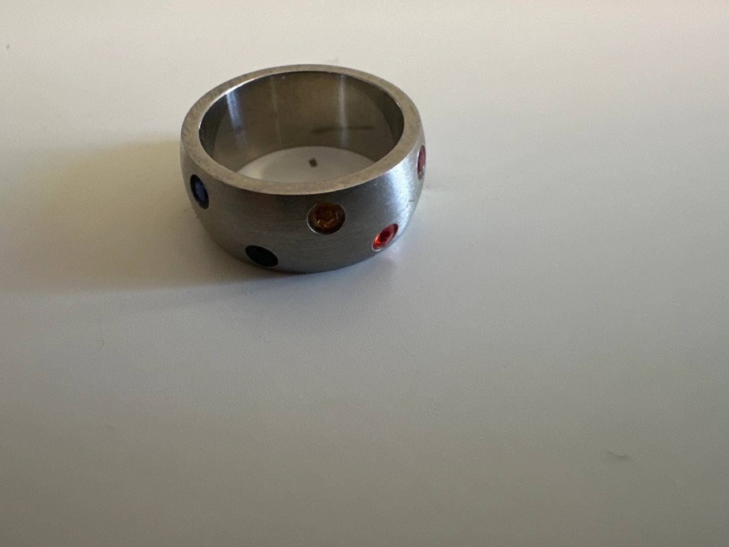 Unique ring. Brushed silver band. Features six small gemstones in varying colours. Looks great!