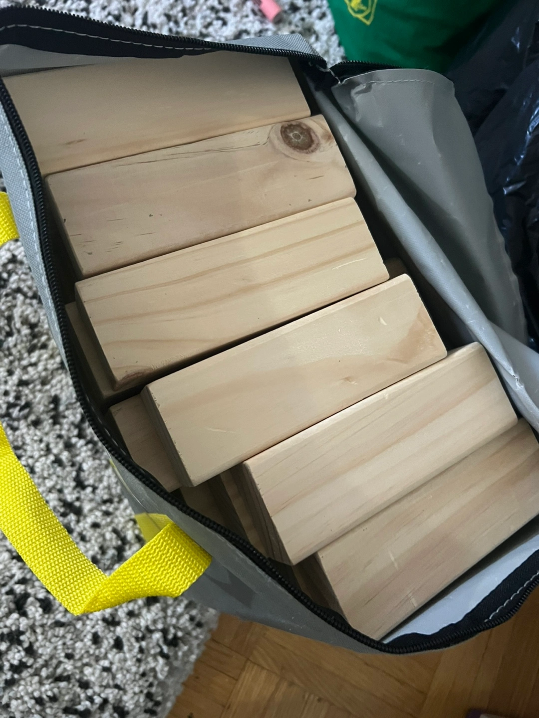 Portable wooden stacking game. 57 blocks included. Great for kids and adults. Includes carrying case. Made of New Zealand pine wood. Used twice Pick up only Located near Mt. Pleasant and Eglinton Ave East