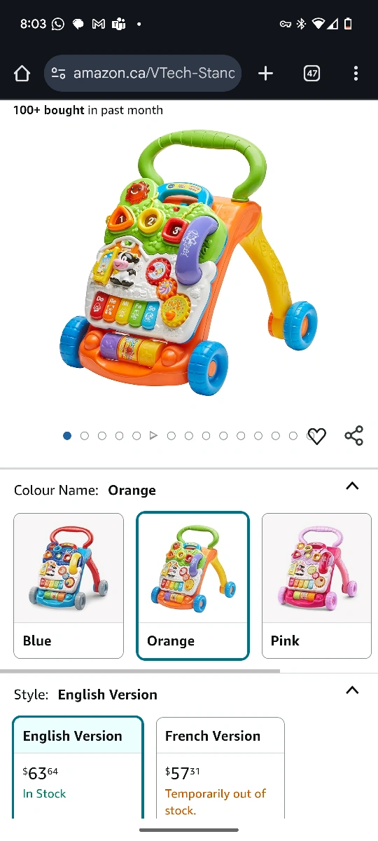 Interactive learning walker. Features lights, sounds, and various activities. Orange colour. English version.
