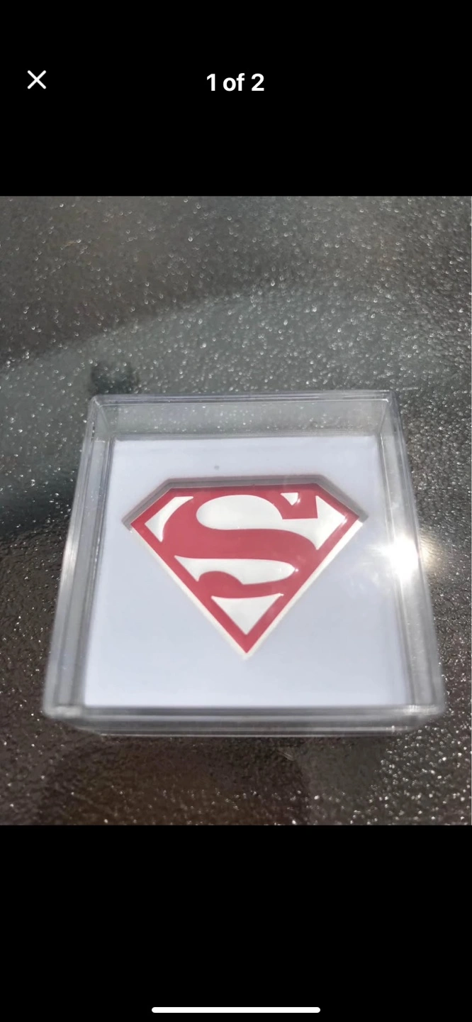 Red and white Superman logo. Comes in a plastic case. Collectible item. Not real silver its silver coated a great Superman collectable $40