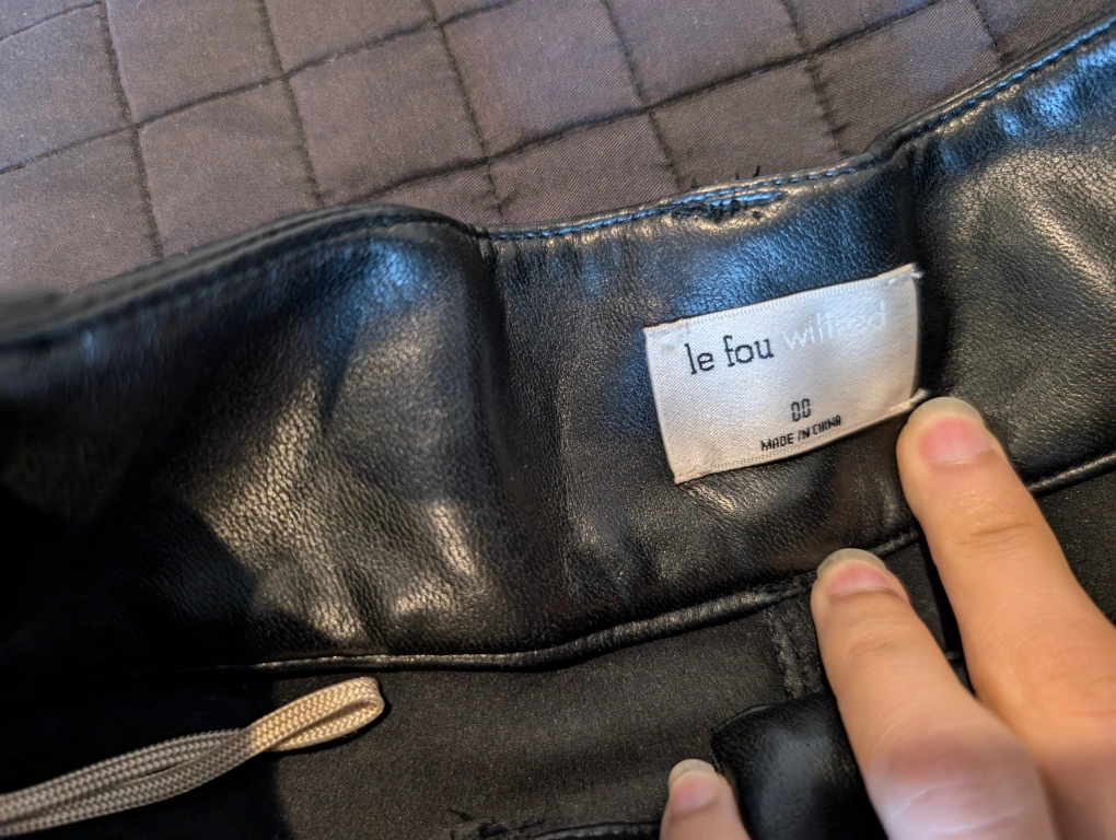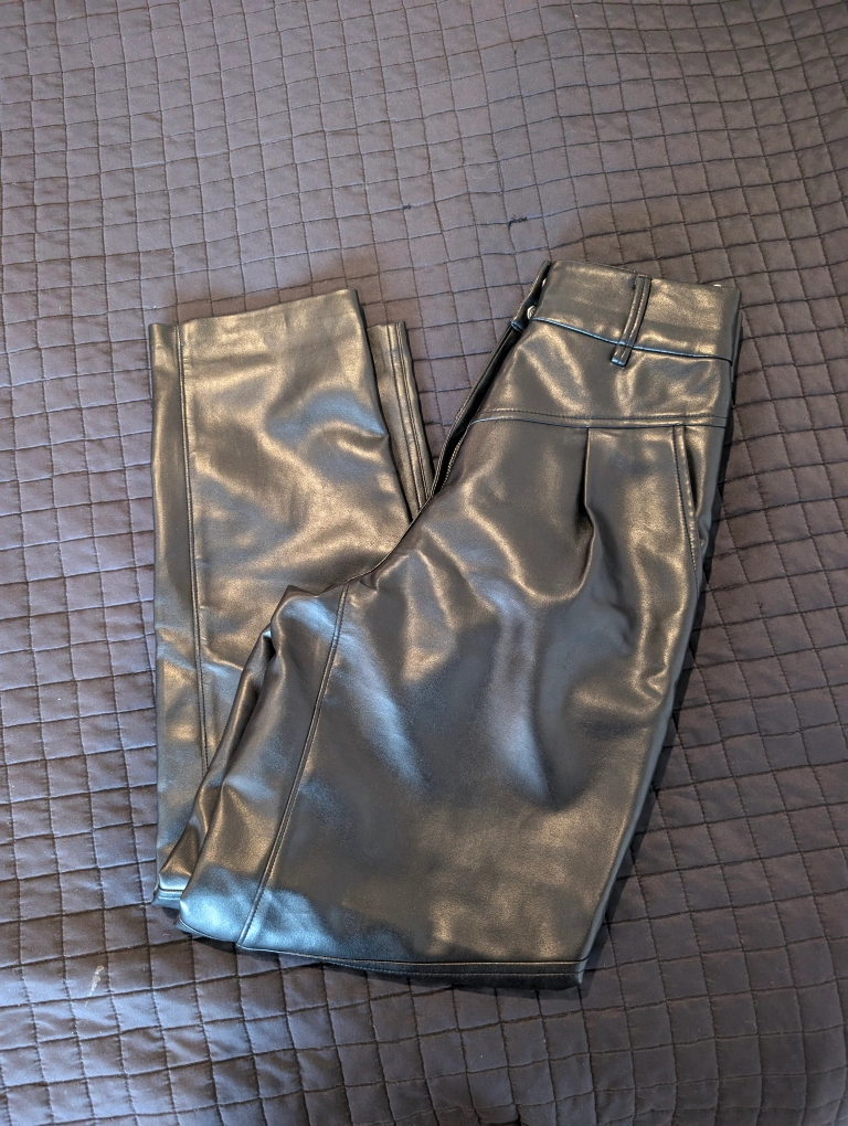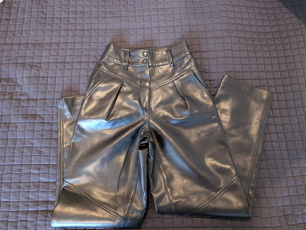 High-waisted leather look pants. With pockets.Pleated front. Zip and button closure. Size 00.
