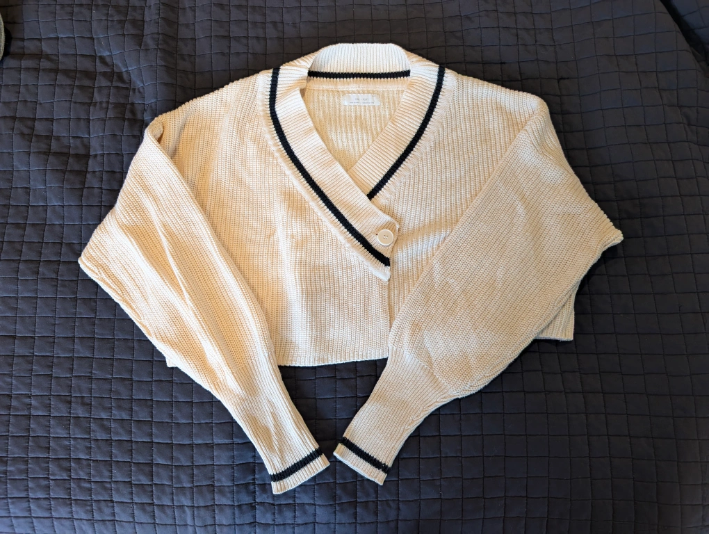 Cropped cardigan, cream colour. Features a v-neck and black trim on the sleeves and collar. Single button closure.