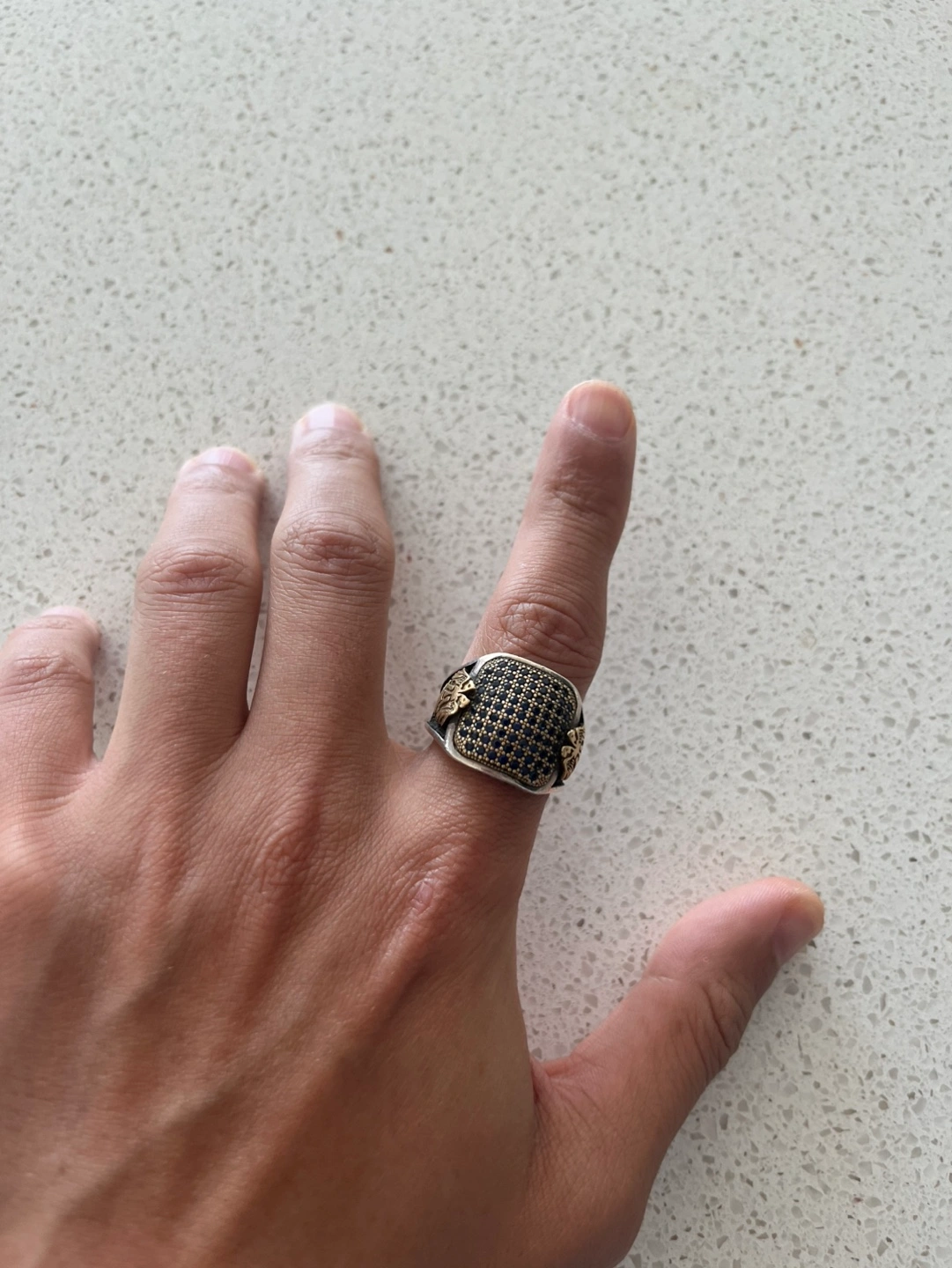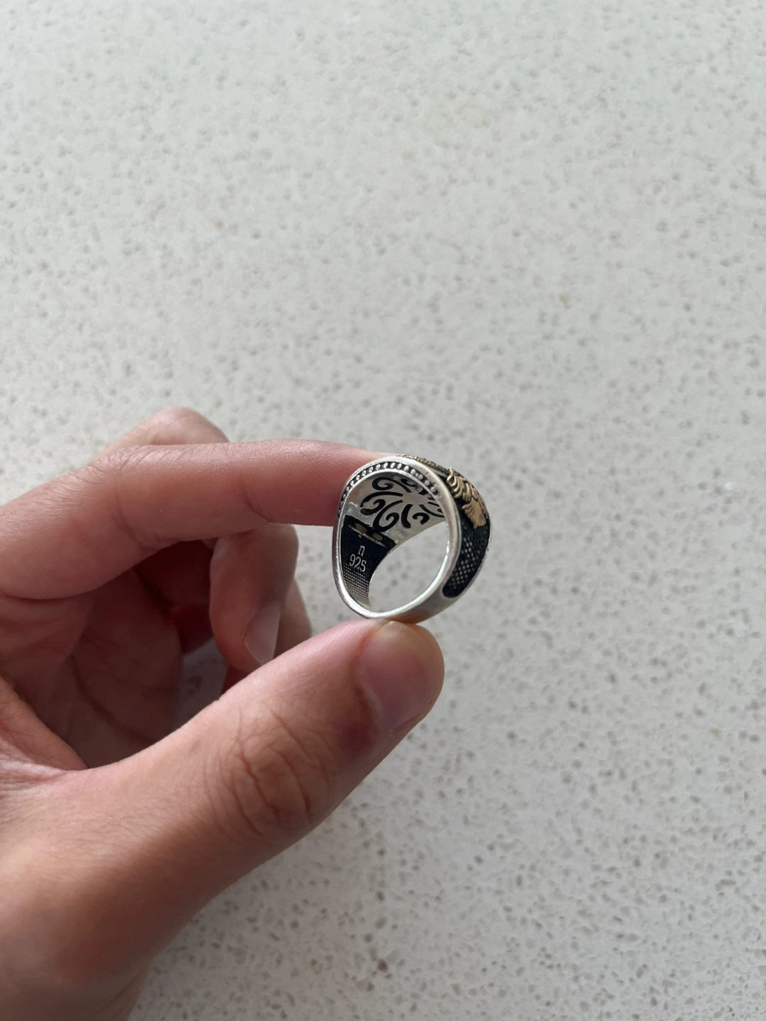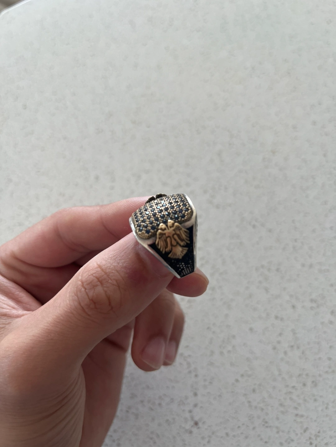 Ornate men’s ring featuring a lightly shimmered rectangular black stone centrepiece. Ornate eagle design on the both sides. 925 Silver and gold-plated tones, with an under-ring intricate floral design.
