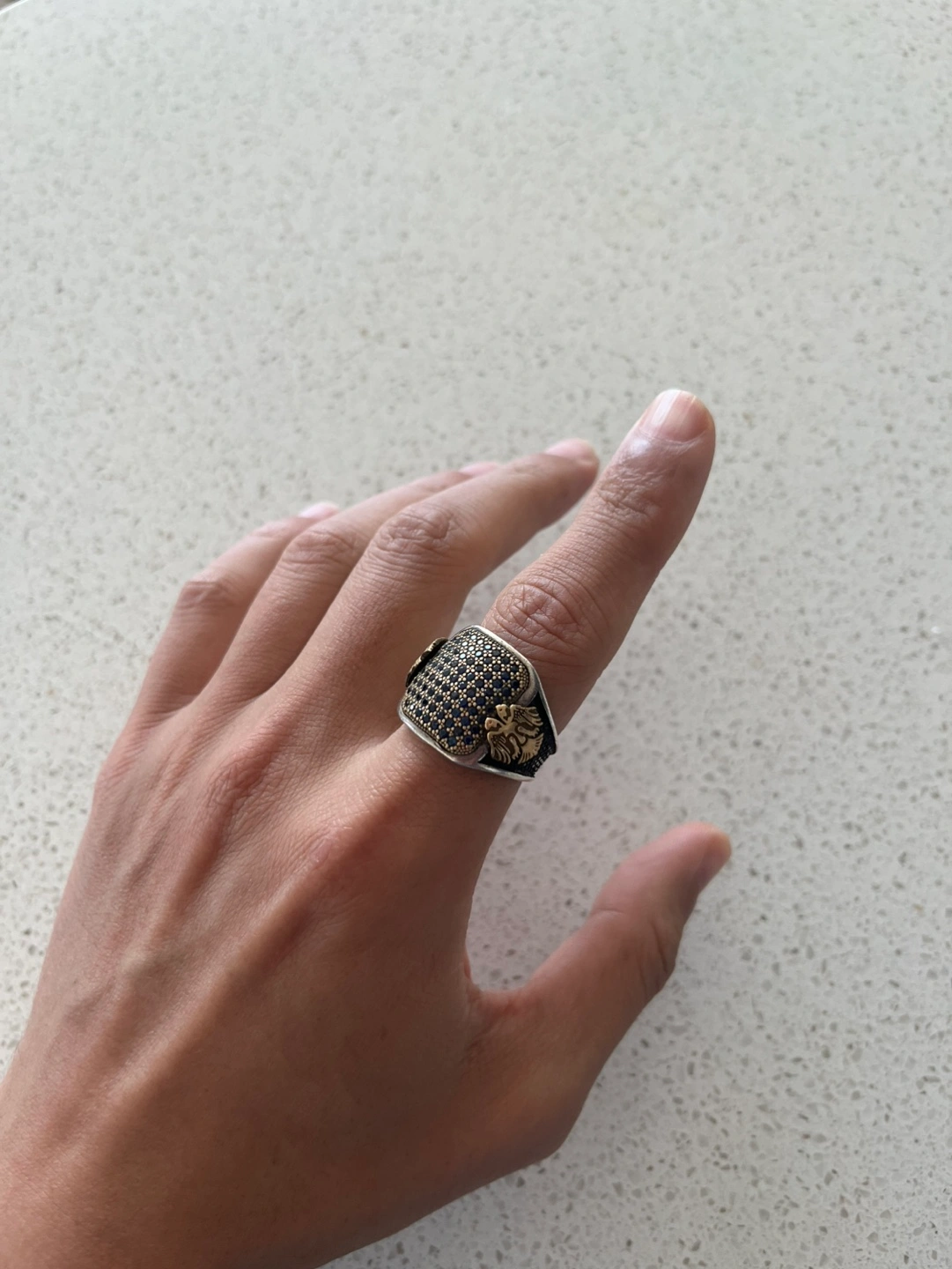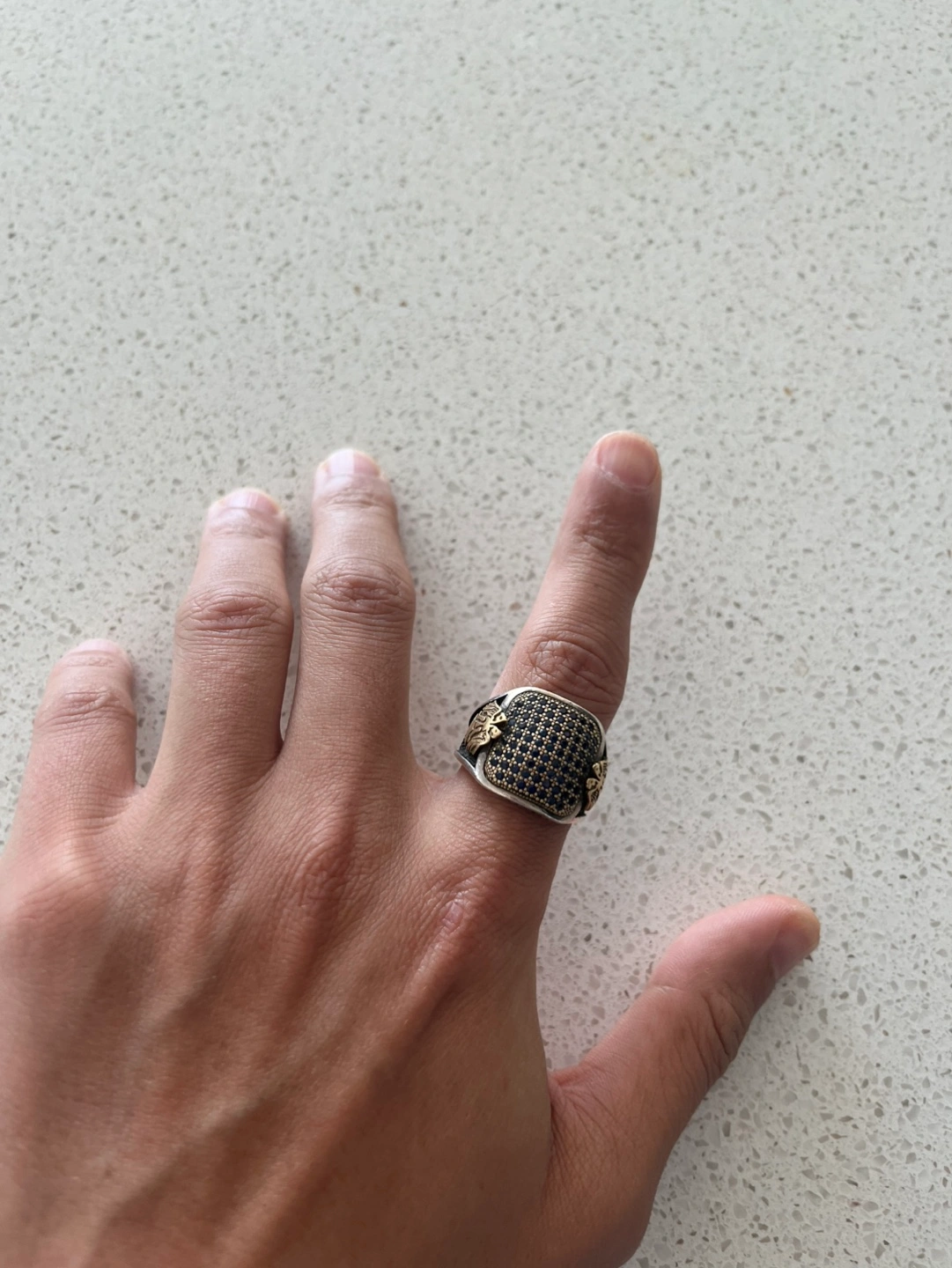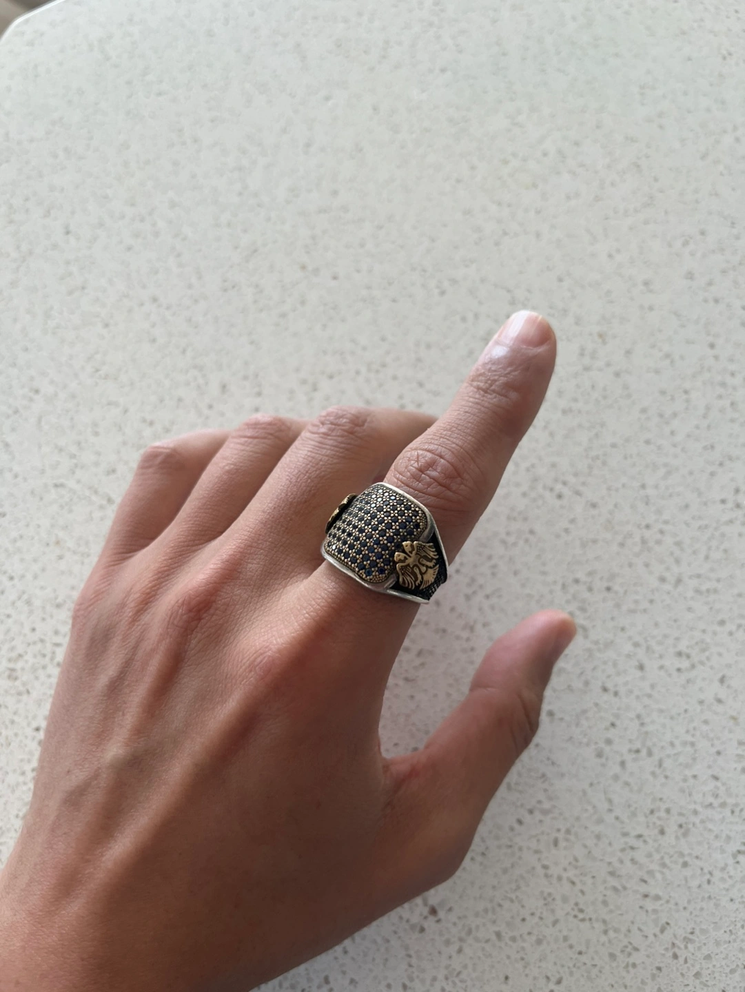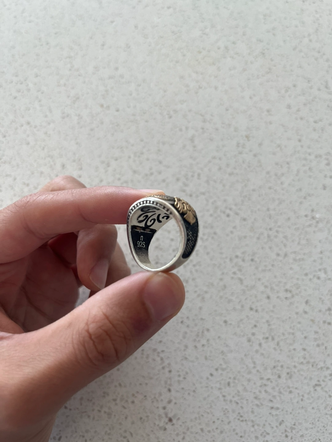 Ornate men’s ring featuring a lightly shimmered rectangular black stone centrepiece. Ornate eagle design on the both sides. 925 Silver and gold-plated tones, with an under-ring intricate floral design.