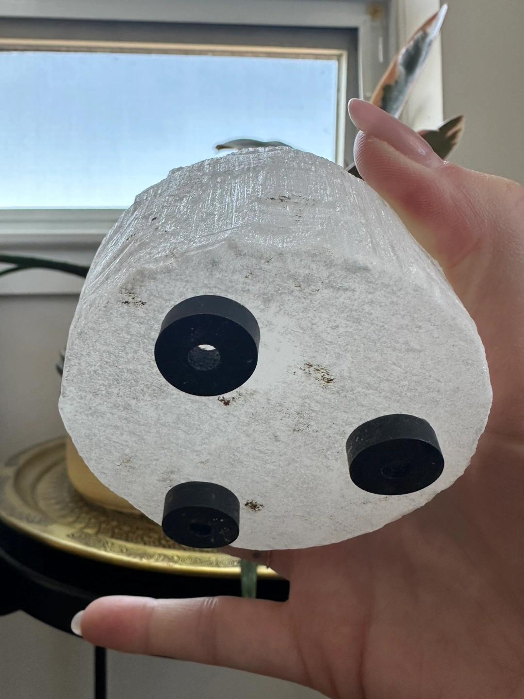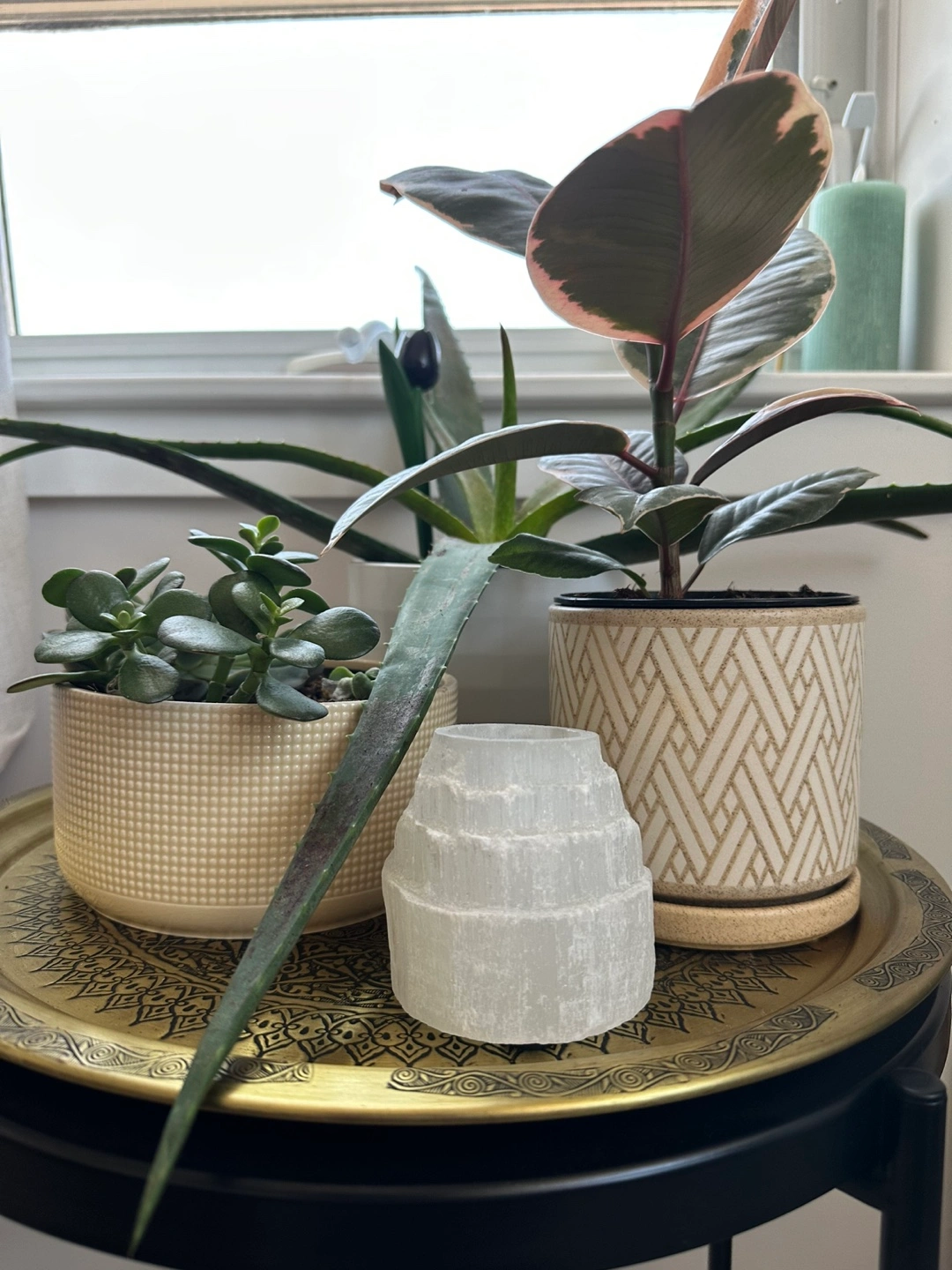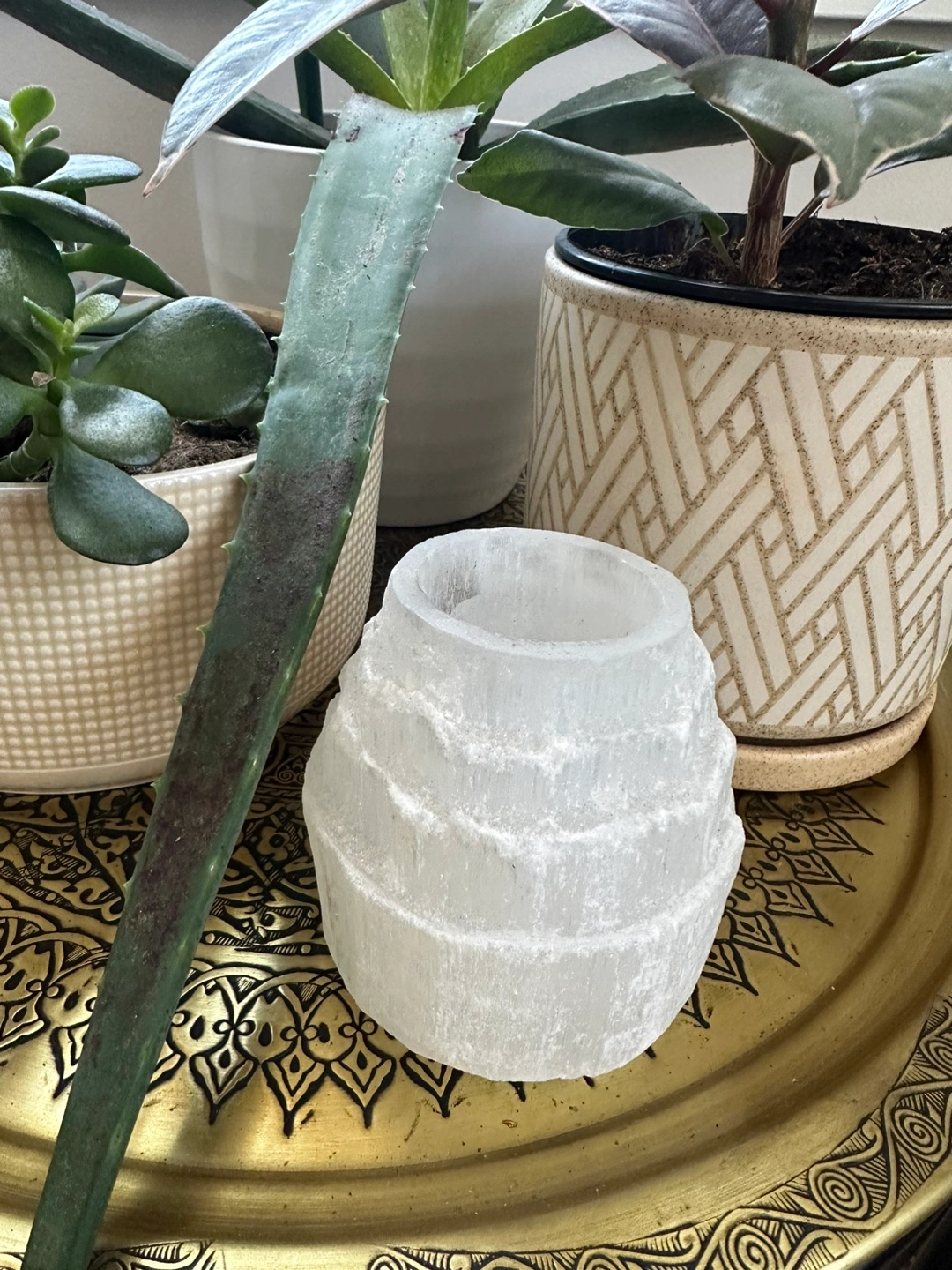 Unique solid selenite candle holder. Beautiful natural texture. Great for adding a touch of serenity to your space. Fits a tea light candle. Selenite is often associated with purity, peace, and higher consciousness, believed to cleanse and recharge energy, promote mental clarity, and facilitate spiritual growth. Approximately 3.5 inches tall.