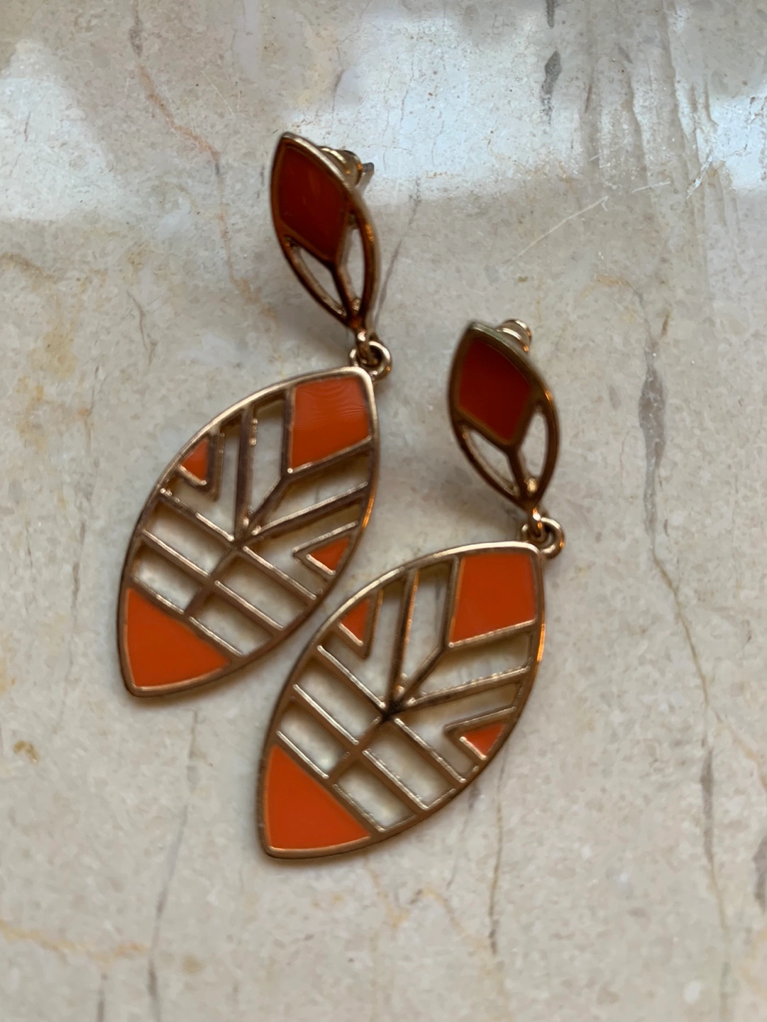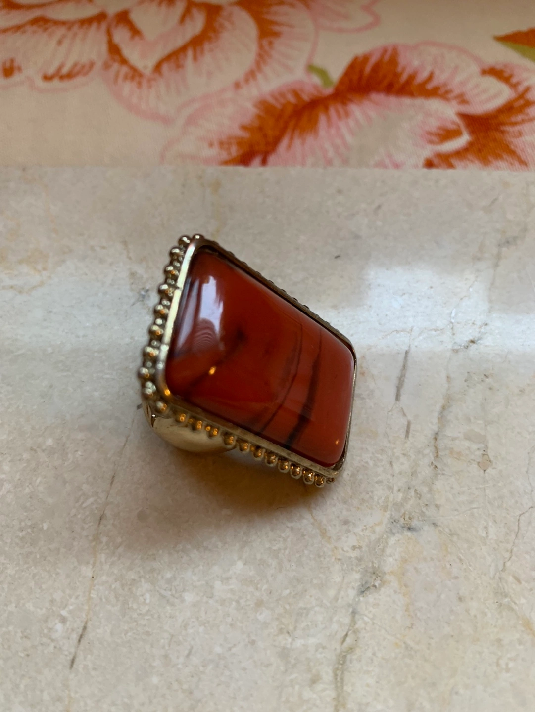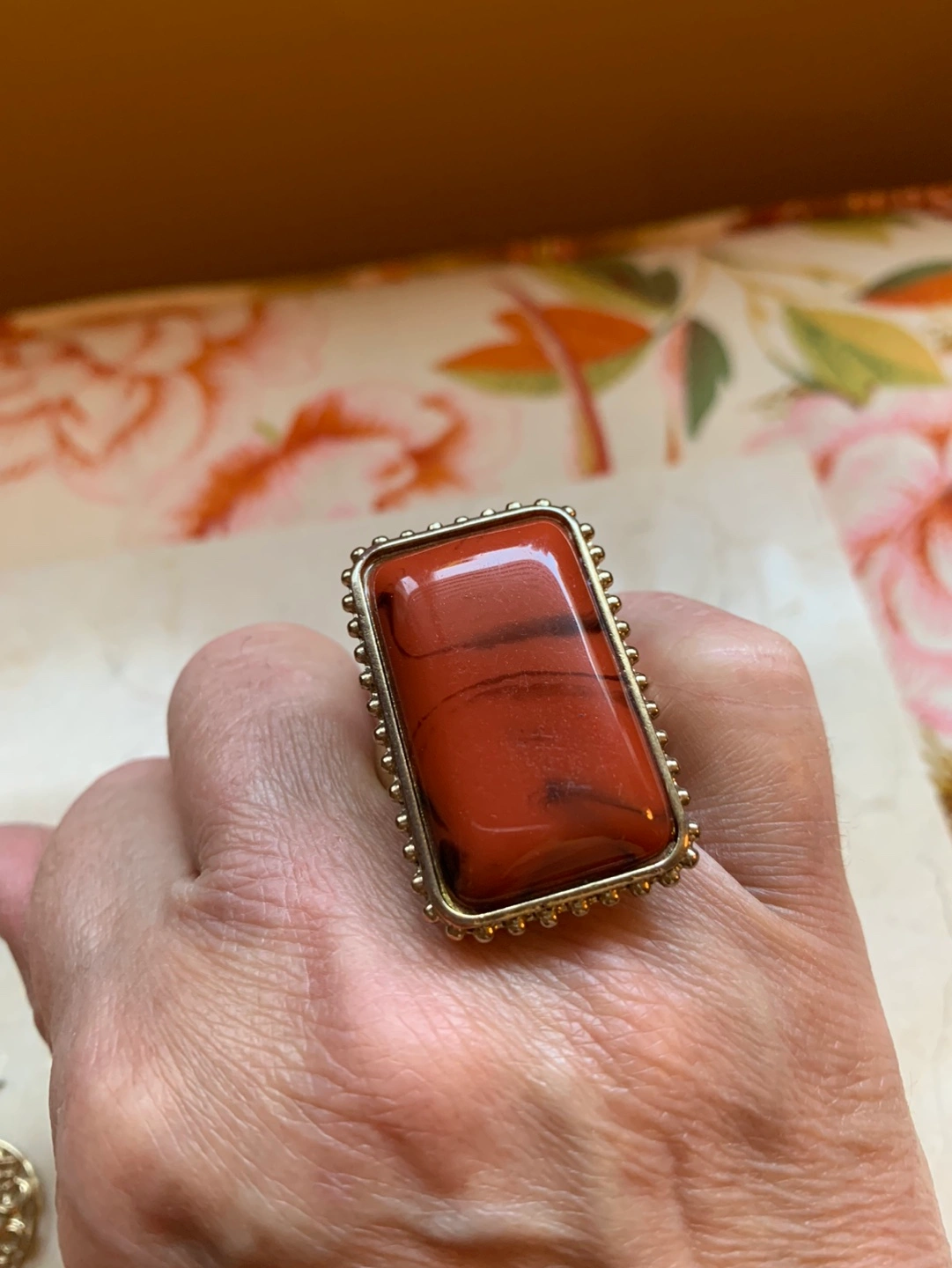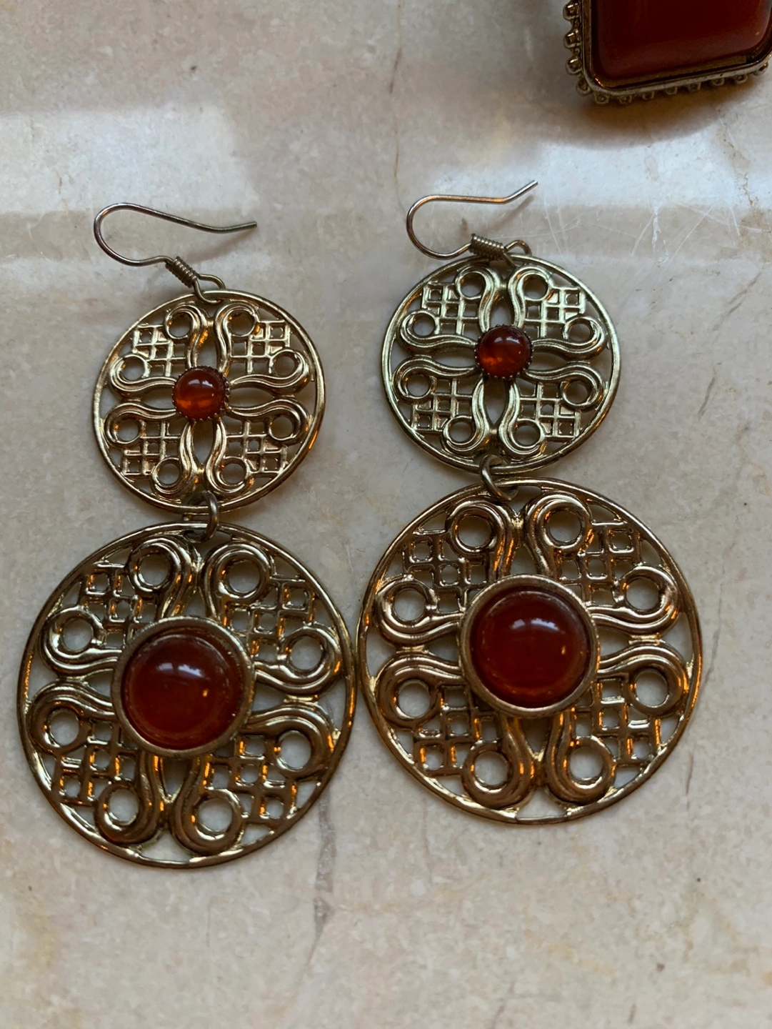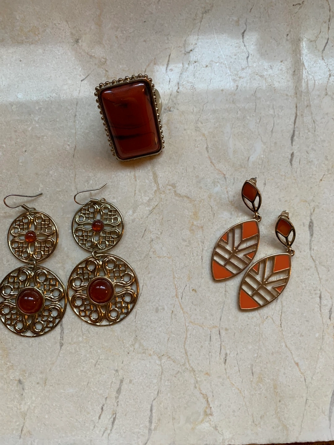 Gorgeous jewelry set featuring a statement ring that is elastic to fit various ring sizes and two pairs of earrings. Ring features a large rectangular orange stone. One pair of earrings features double circular designs with small reddish brown stones; the other pair features a leaf design. Gold-tone metal. Excellent for adding a touch of elegance to any outfit. Cash only please.
