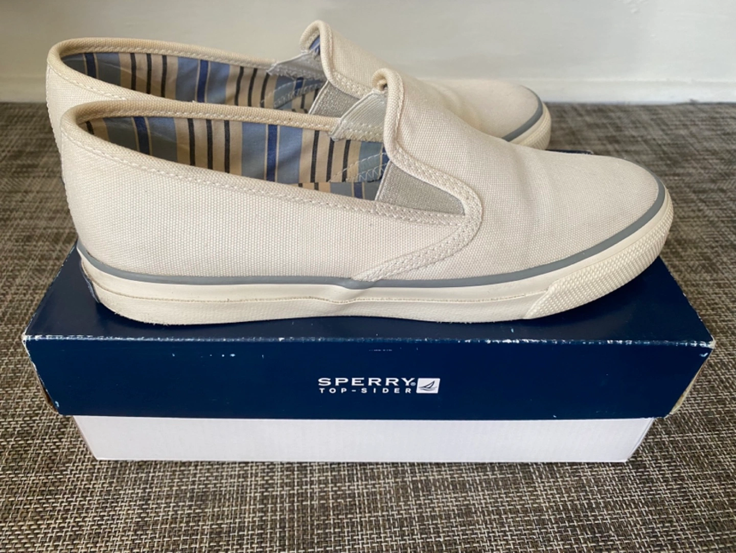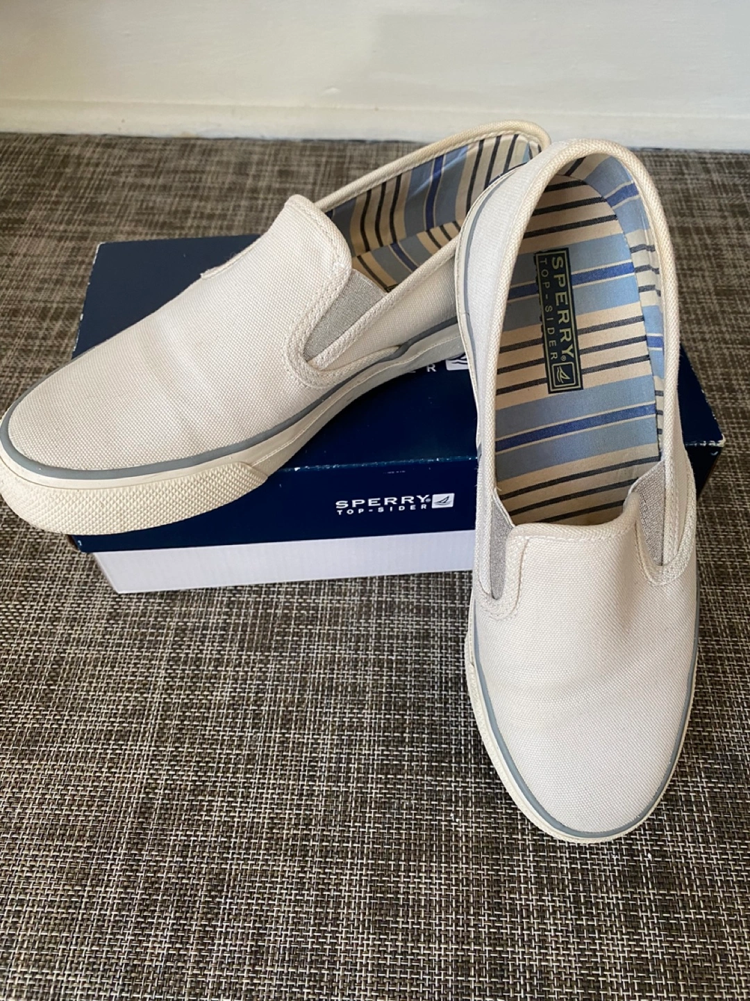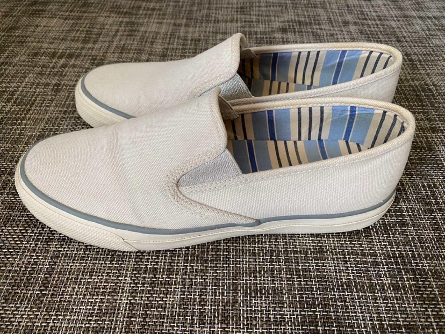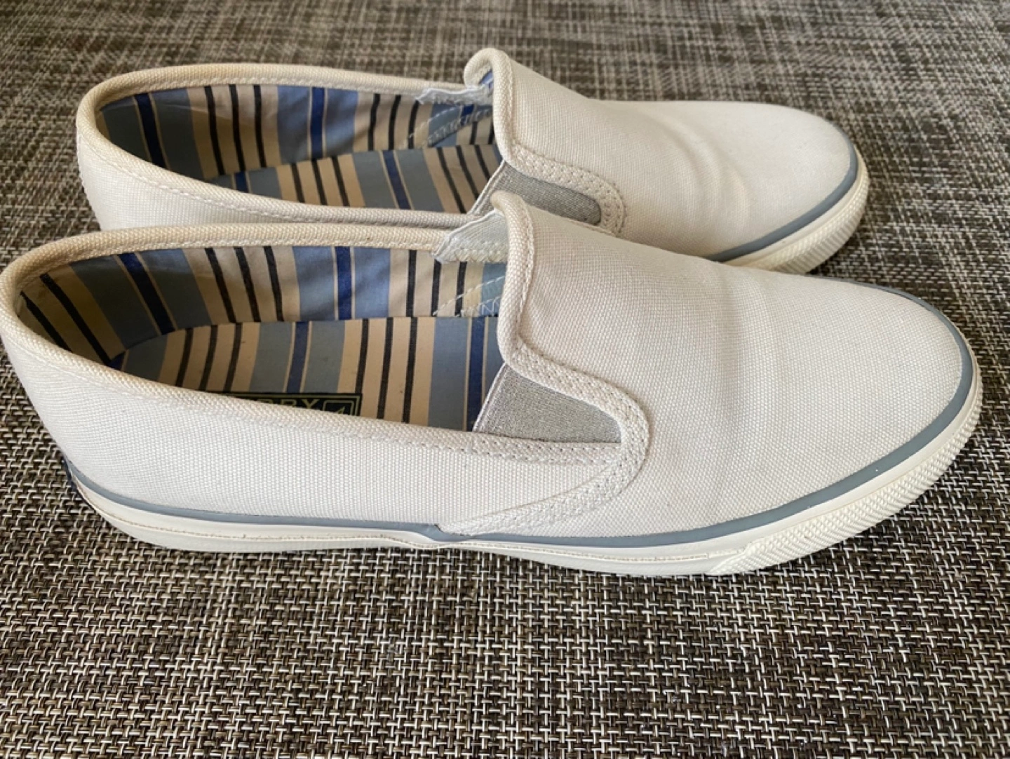 Women's slip-on canvas sneakers. Off-white colour. Sperry Top-Sider branding. Lightly used.
