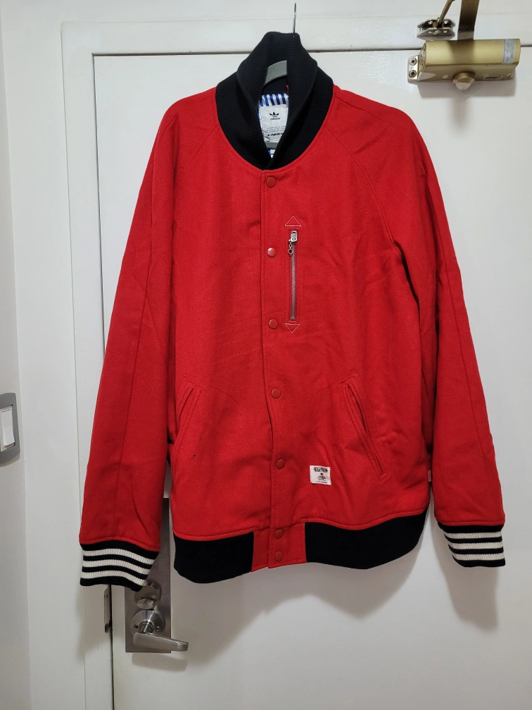 Men's Adidas Originals Tokyo varsity jacket. Red wool body, black ribbed collar and cuffs. Features a small zippered pocket and snap buttons. Classic varsity style. Used. One small stain on right pocket. (pictured) -Cash only. Pickup only. -House with pets♥️