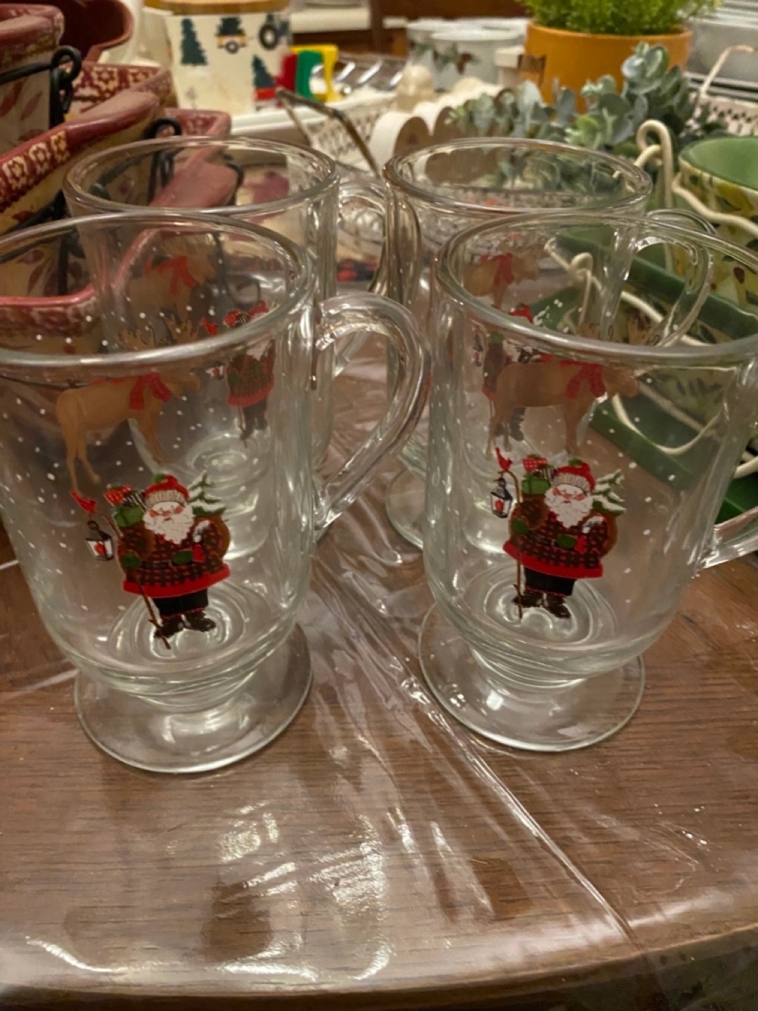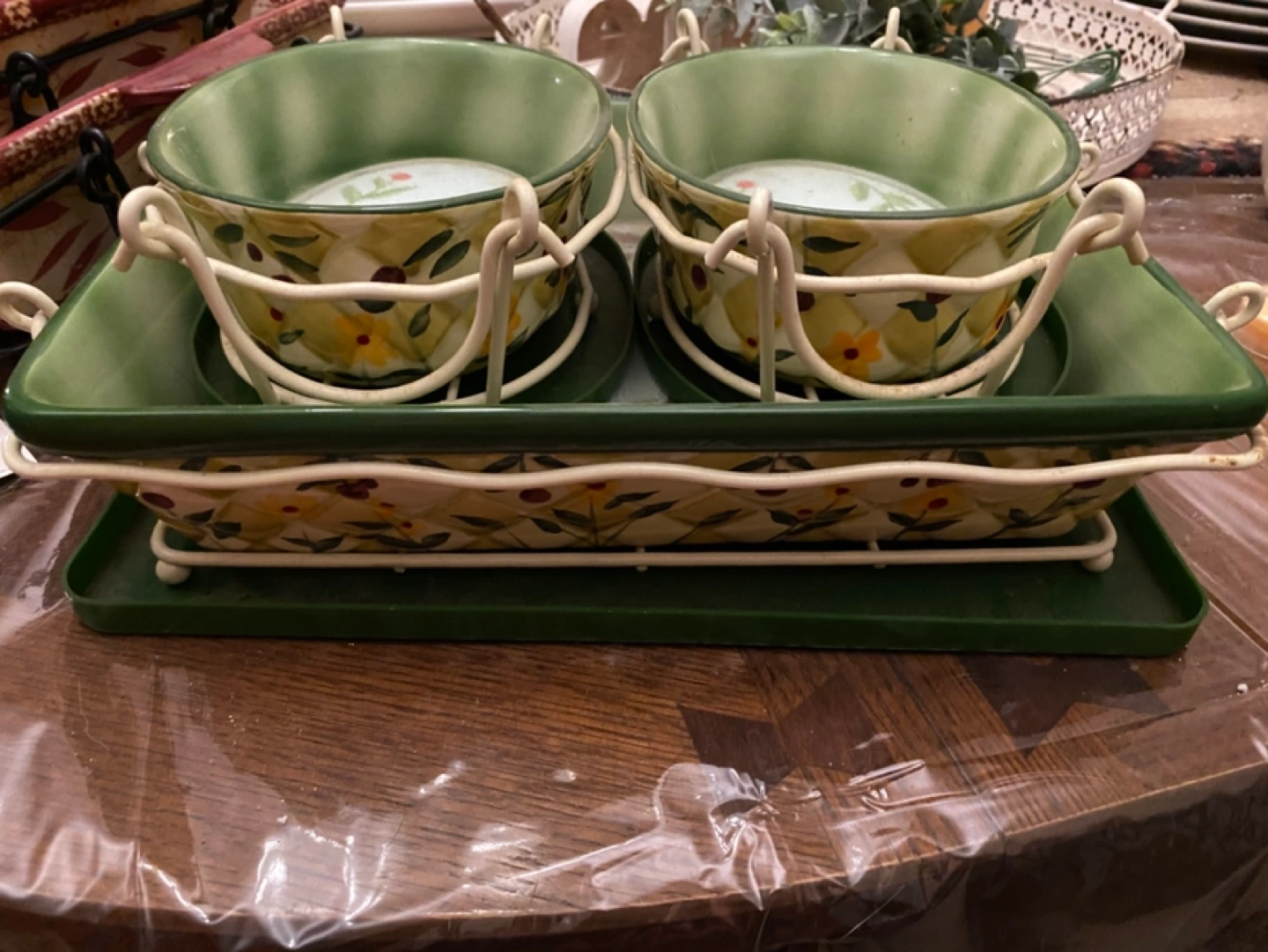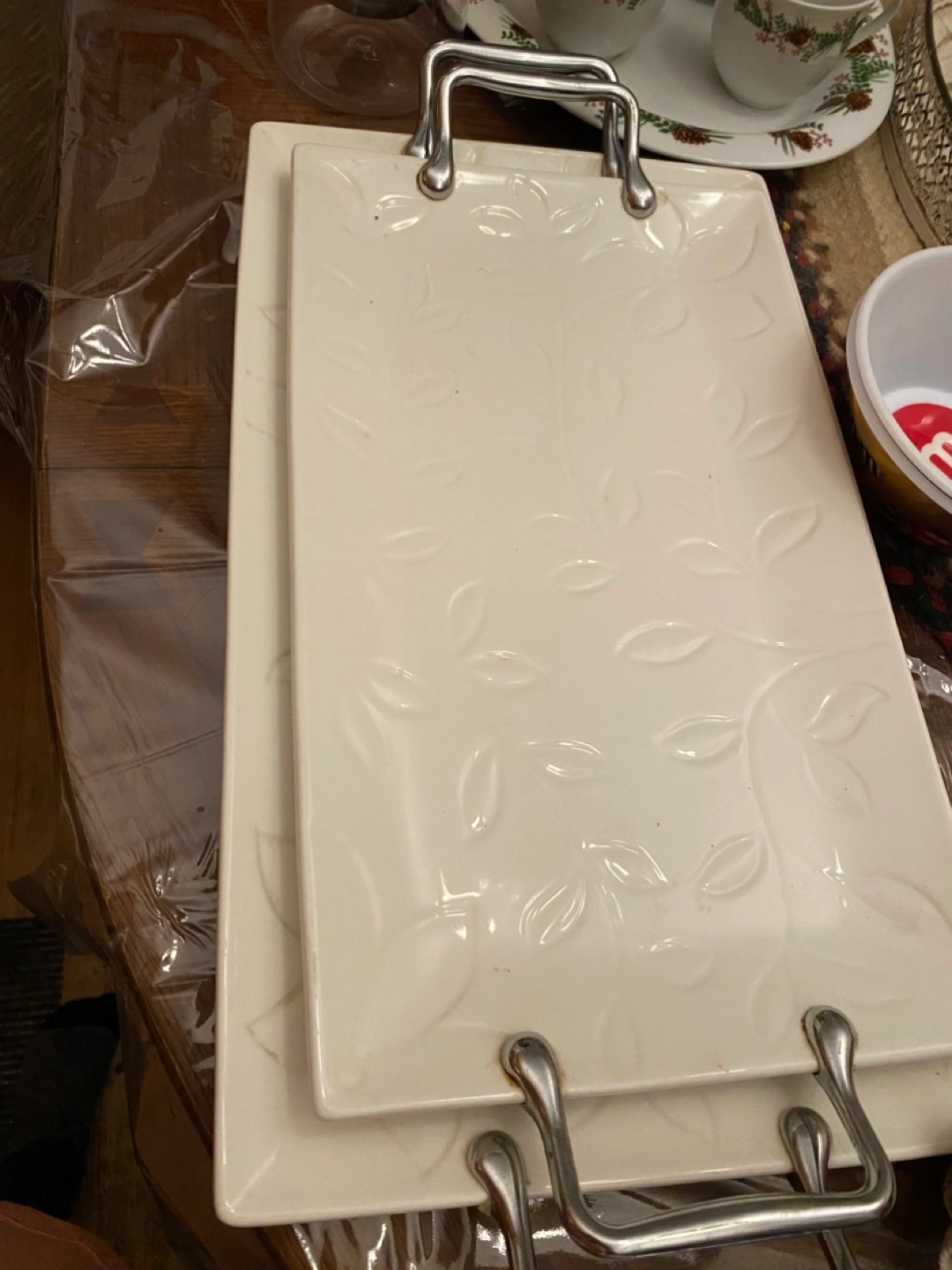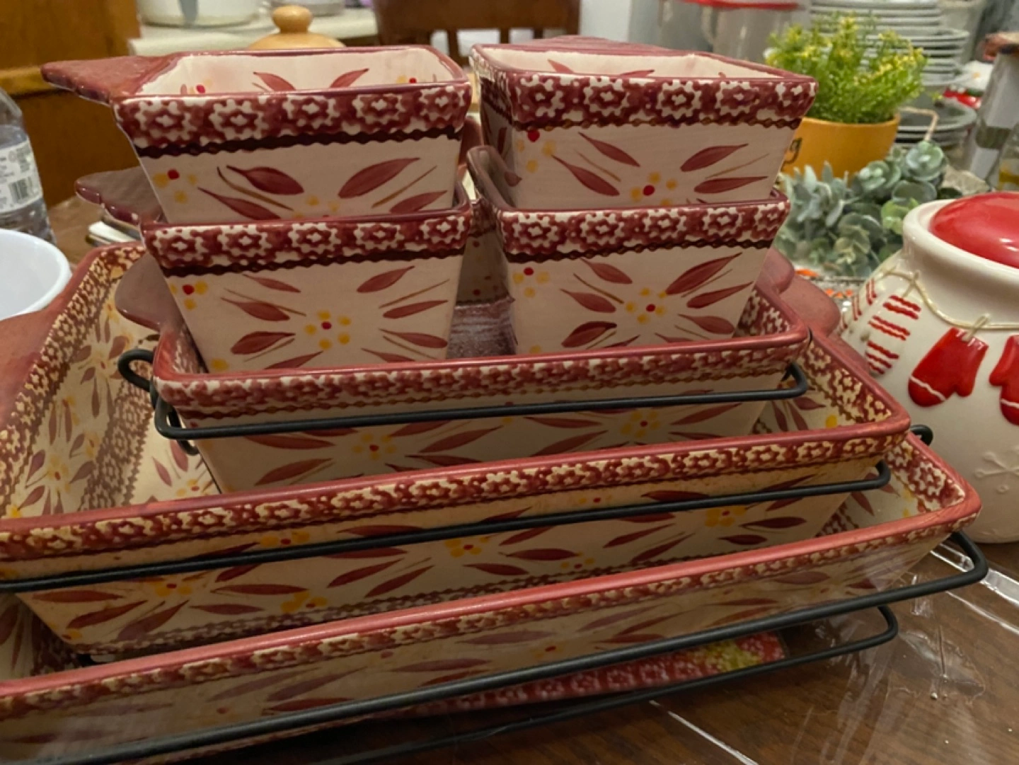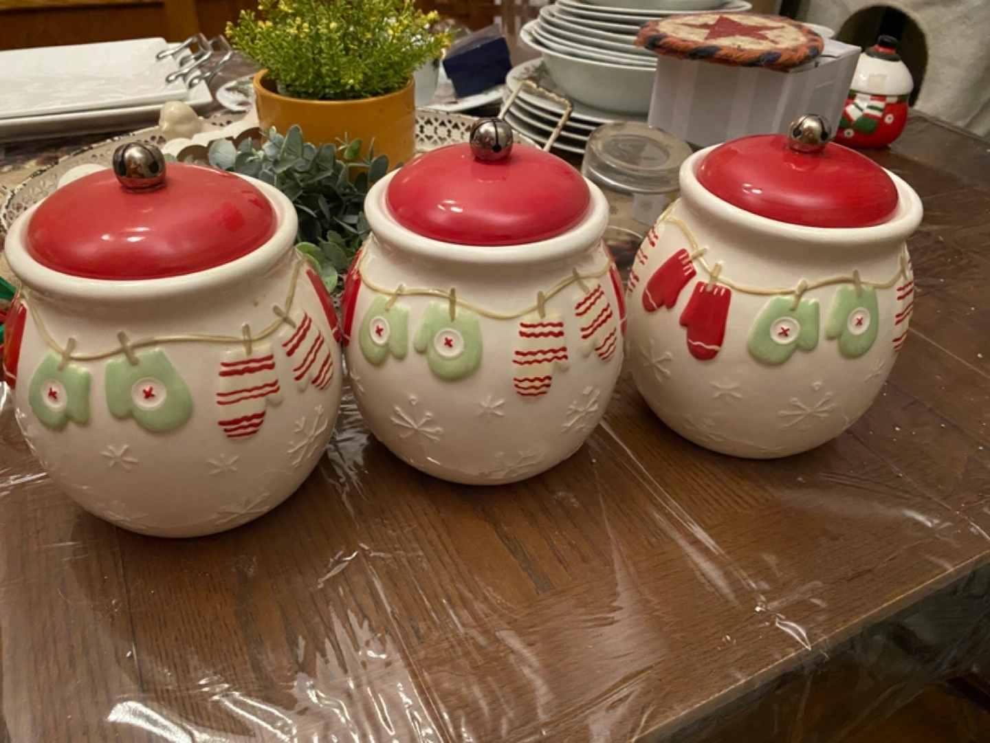 Large bundle of kitchenware and holiday items. Includes two travel mugs with lids, a set of red patterned baking dishes with rack, a green patterned serving set with bowls and tray, two white serving trays with handles, and three Christmas canisters with red lids. Great for everyday use and entertaining.