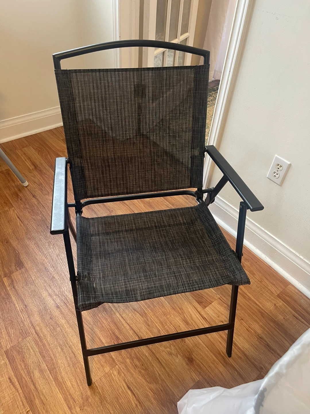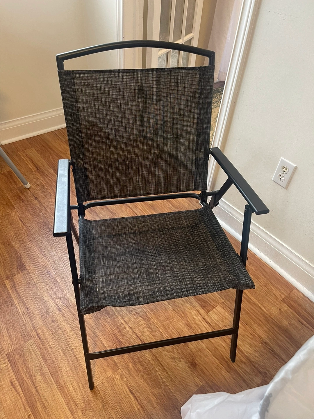 Black metal frame. Grey fabric sling. Folds for easy storage. Great for patios, balconies, or camping.