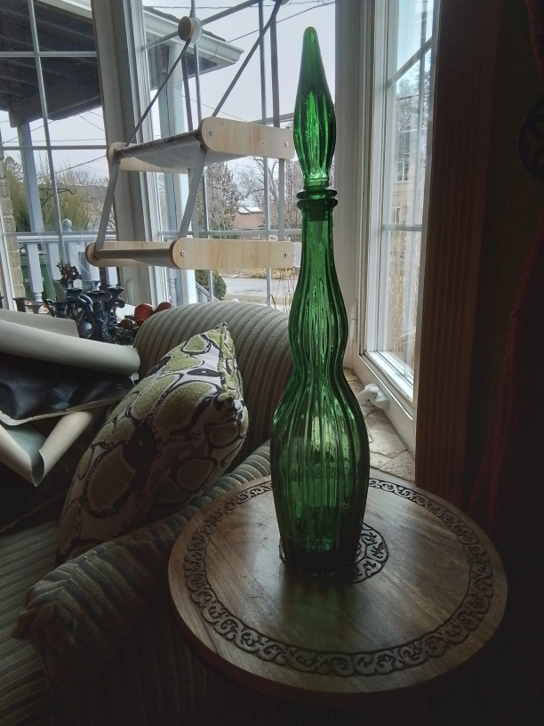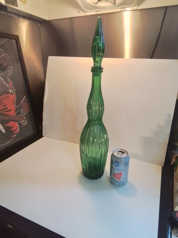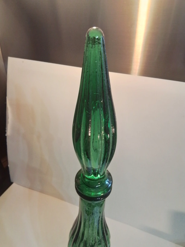 Vintage Green Handblown Empoli Decanter with Stopper Add a touch of elegance to your home decor with this decorative green glass bottle. This unique piece features a distinctive shape and vibrant green hue, perfect for display on a shelf, table, or as part of a decorative arrangement. It is in good condition, ready to enhance any room with its stylish presence. 21" tall to top of stopper - 15.5" to top of decanter Spruce up your space with this charming glass bottle—remember, if the ad's up, it's still available! Tall, dark green glass decanter. Features a unique ribbed design and a pointed stopper. Perfect for a mid-century modern decor style. Collectible. Pickup at Young Street and Steels Ave