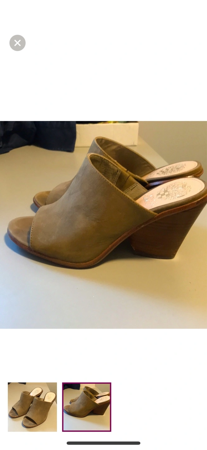 Pair of olive green suede wedge mules. Open toe, slip-on style. Wooden wedge heel. Size 7.