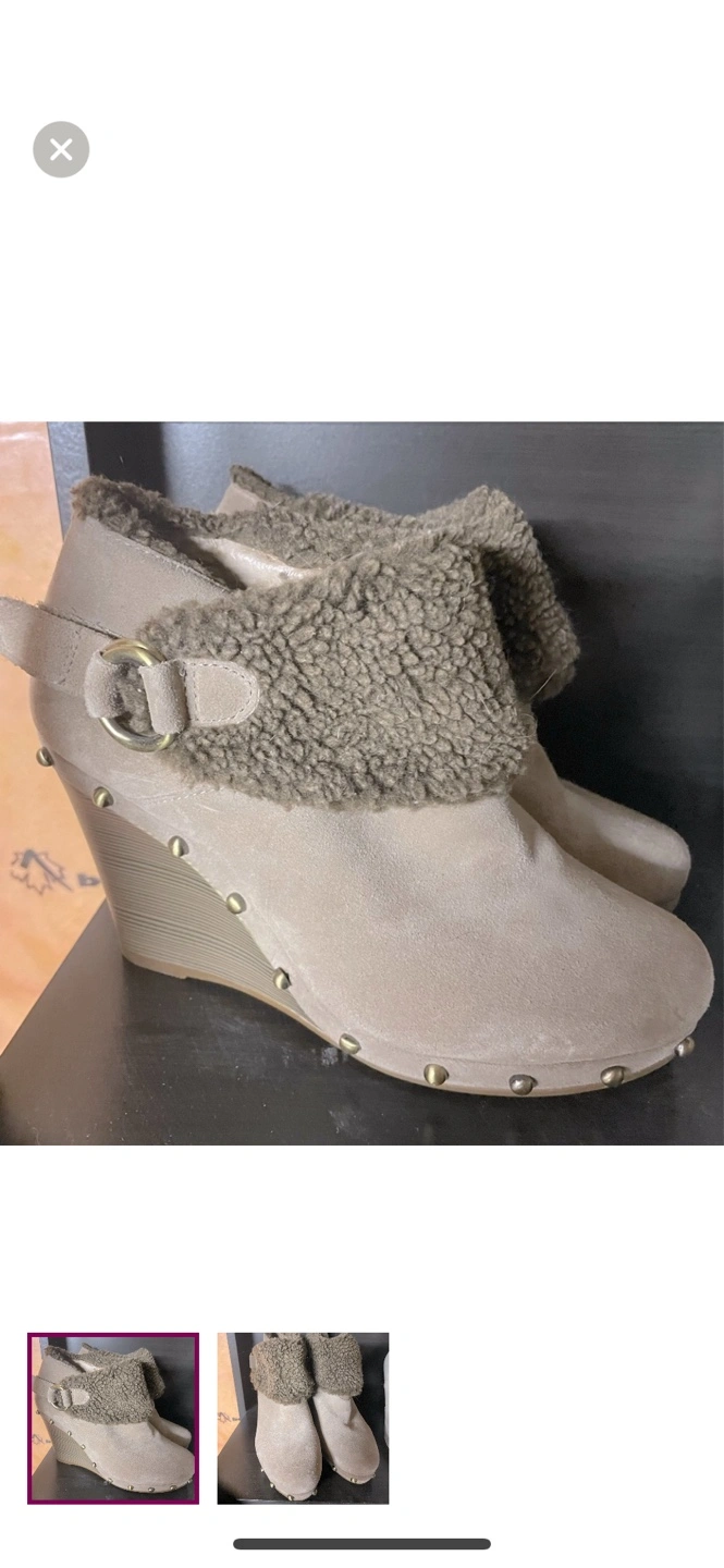 Cozy wedge booties. Grey suede upper. Faux fur trim. Metal studs along the wedge. Wedge heel.