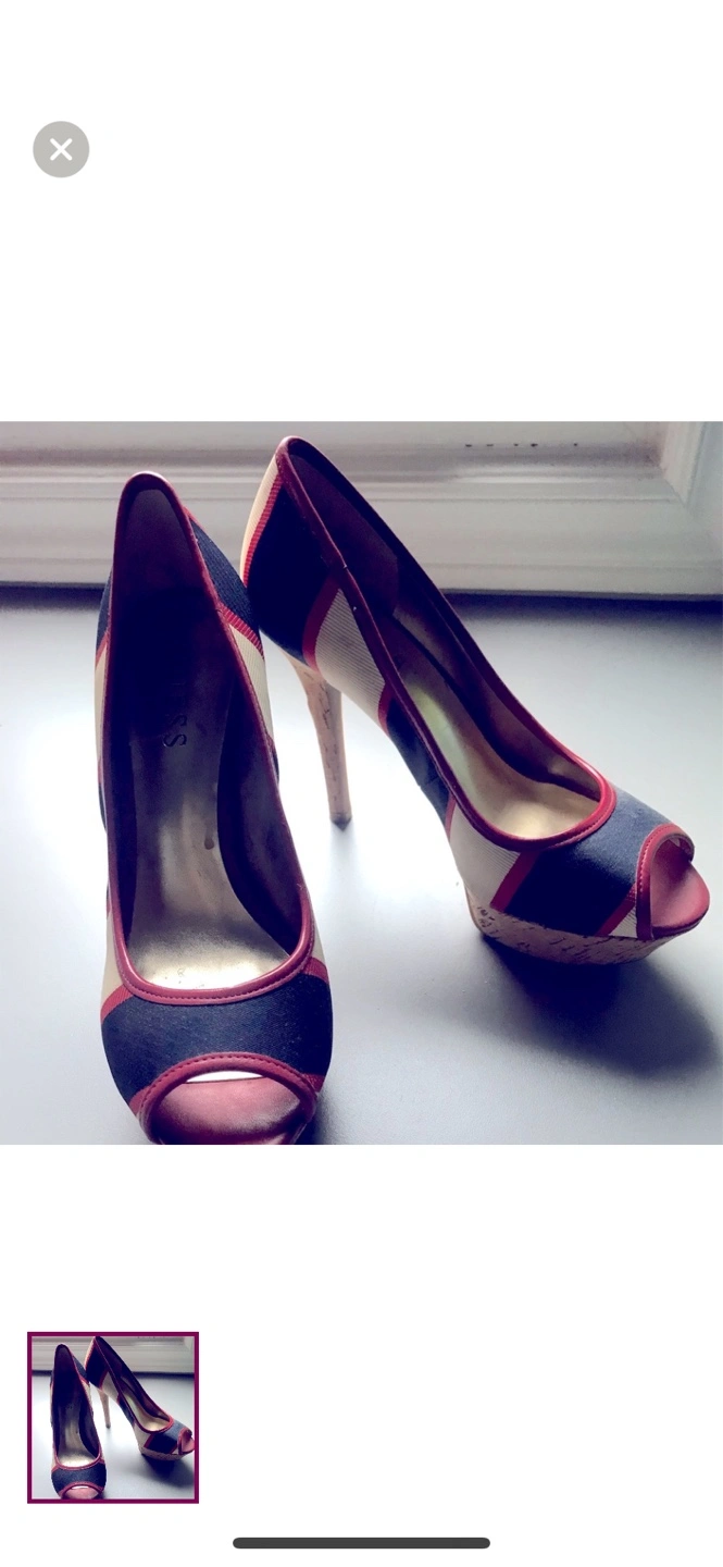 Pair of women's high heels. Peep toe design. Striped fabric upper. Cork platform. High heels.