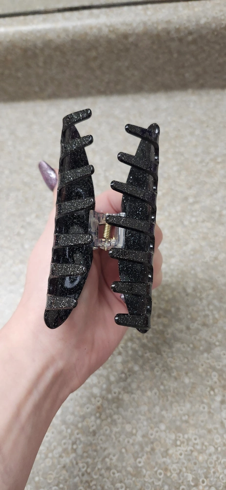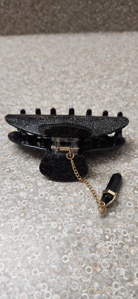 black glitter hair claw. Features a small gold chain and black charm. Perfect for adding a touch of sparkle to any hairstyle.