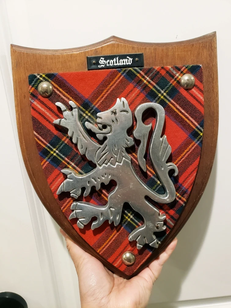 Wooden shield-shaped wall hanging. Features a metallic lion rampant on a tartan background. Scotland label.