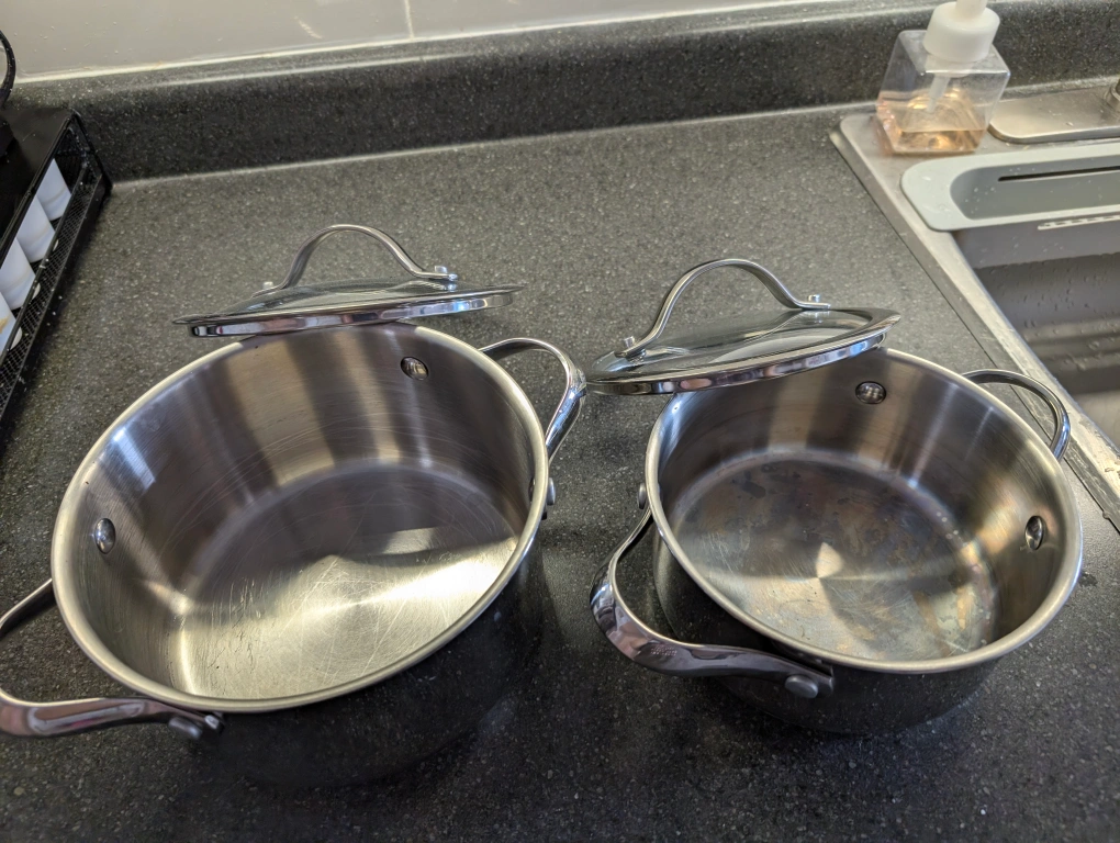 Set of two stainless steel saucepans. Includes glass lids. Suitable for various cooktops. pick up only