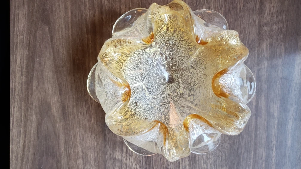 Small, decorative glass bowl. Unique design. Measures approximately 4 inches in diameter. Beautiful gold and clear colours. Excellent for trinkets or display.