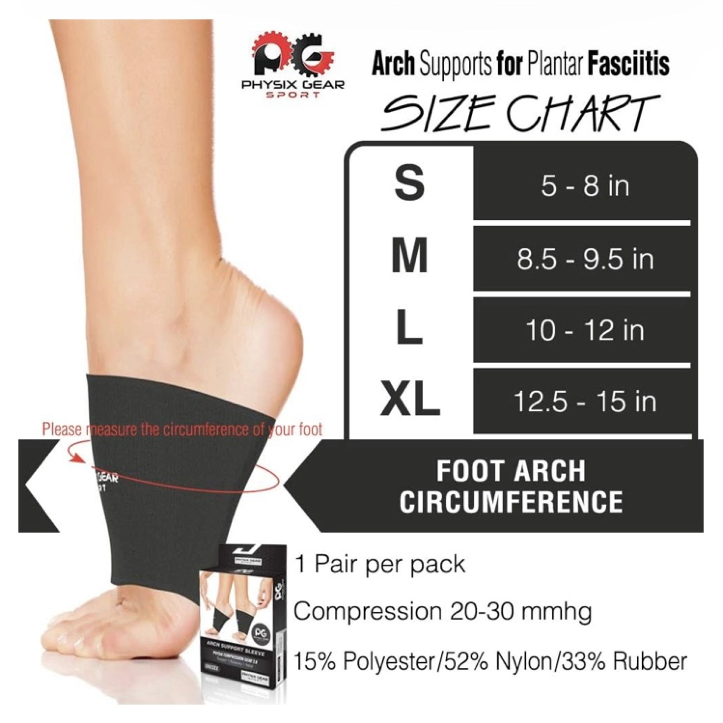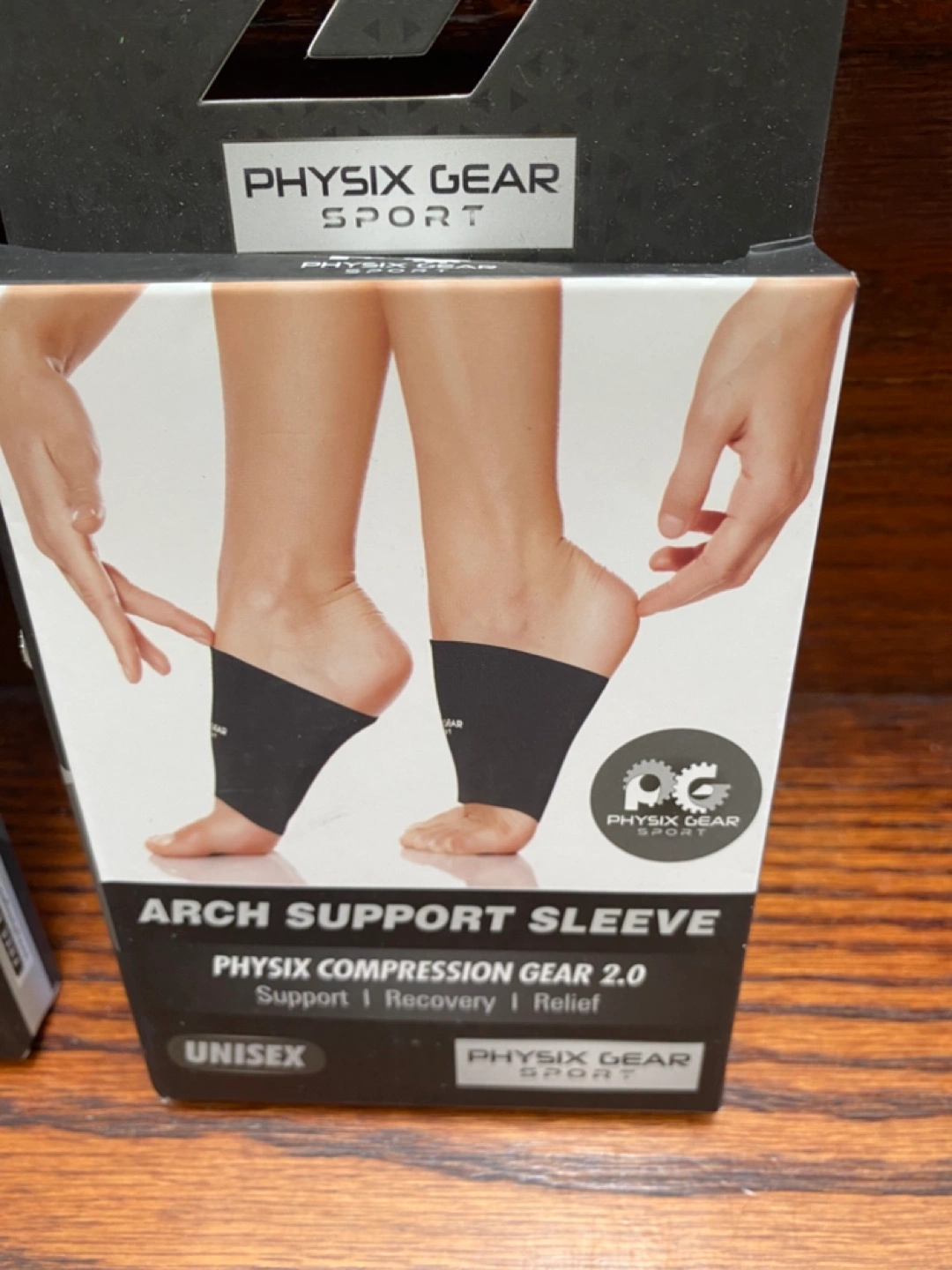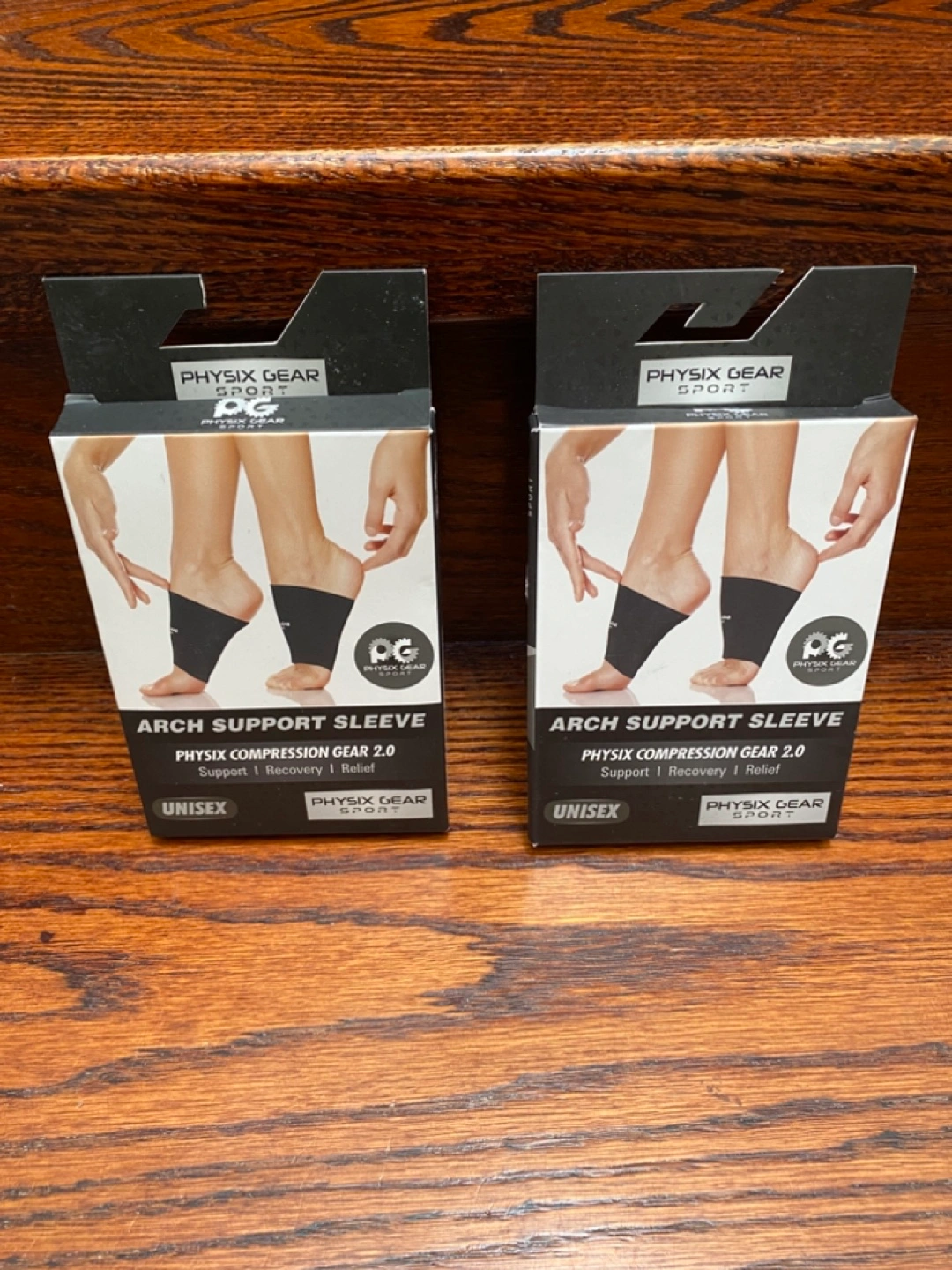 Two pairs of unisex Physix Gear Sport arch support sleeves. Size XL. Provides support, recovery, and relief. Compression 20-30 mmHg. 15% Polyester/52% Nylon/33% Rubber. Machine washable. Unisex Cash only