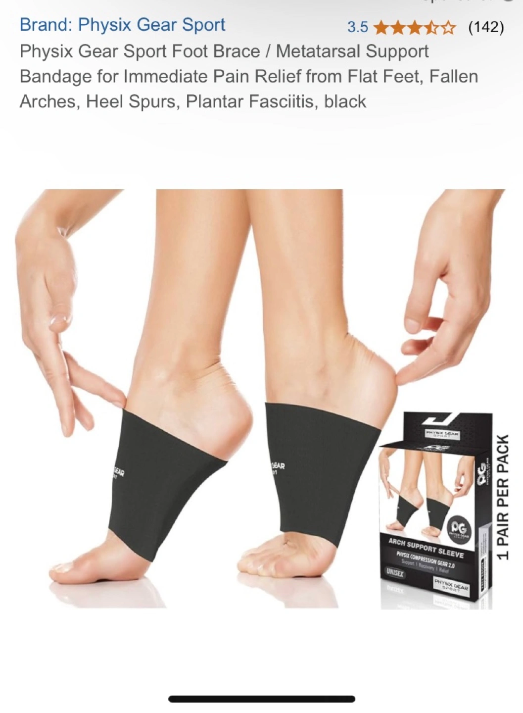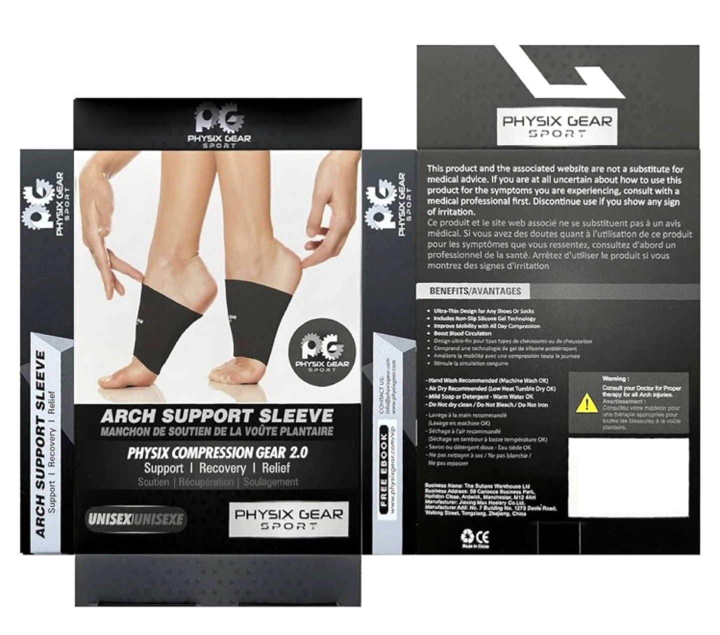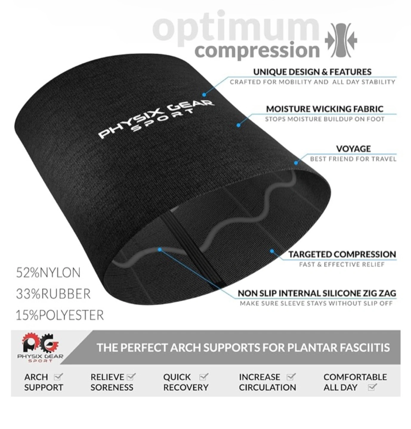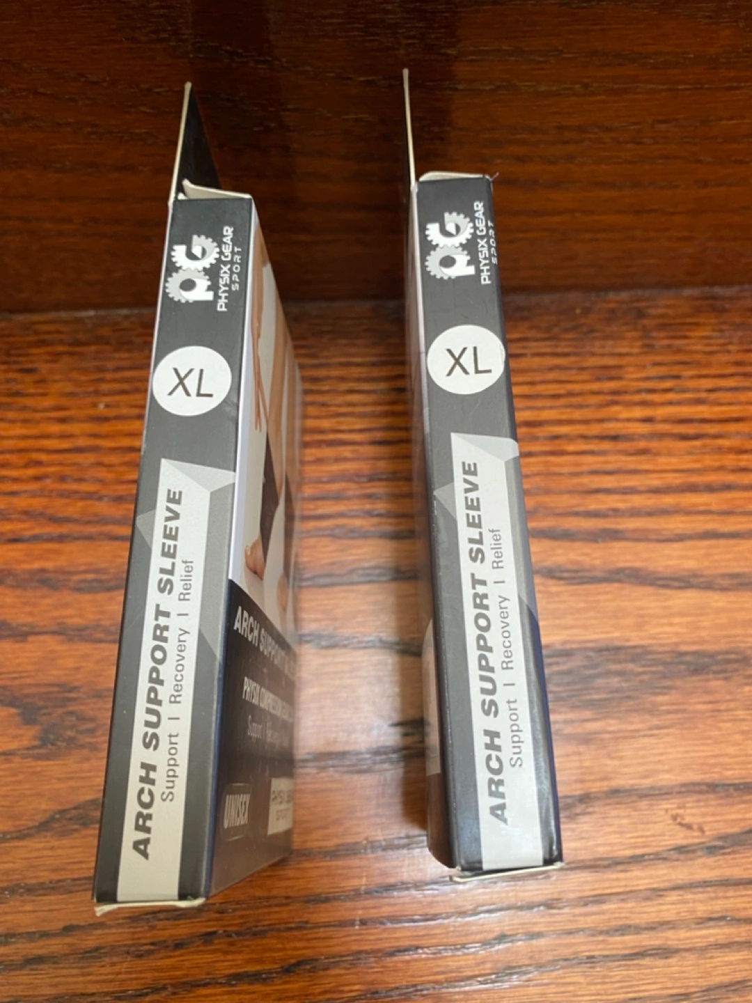 Two pairs of unisex Physix Gear Sport arch support sleeves. Size XL. Provides support, recovery, and relief. Compression 20-30 mmHg. 15% Polyester/52% Nylon/33% Rubber. Machine washable. Unisex Cash only