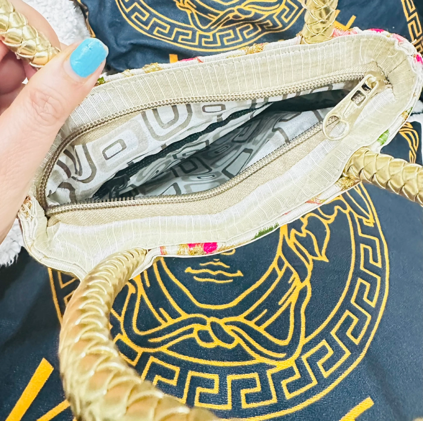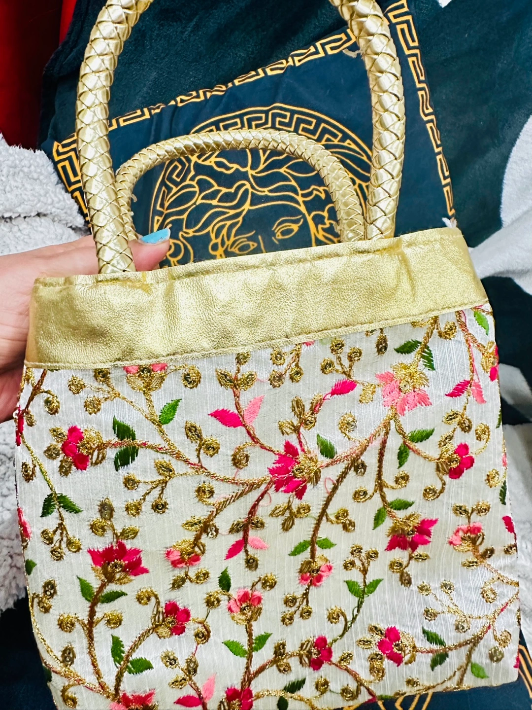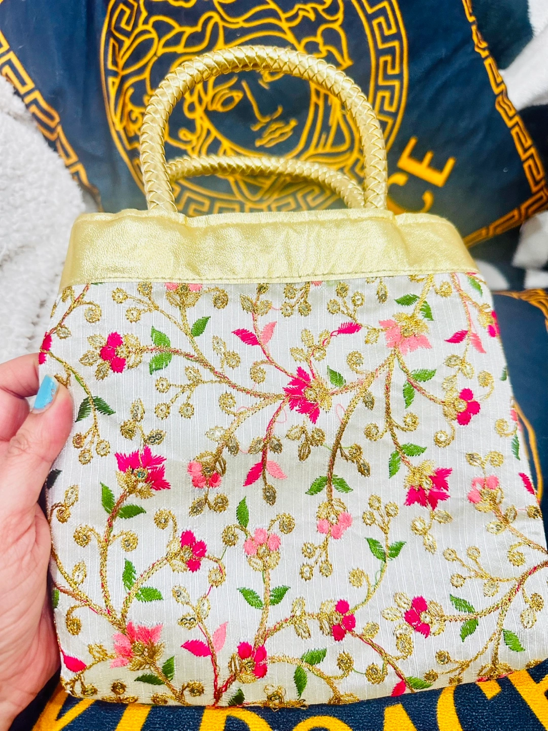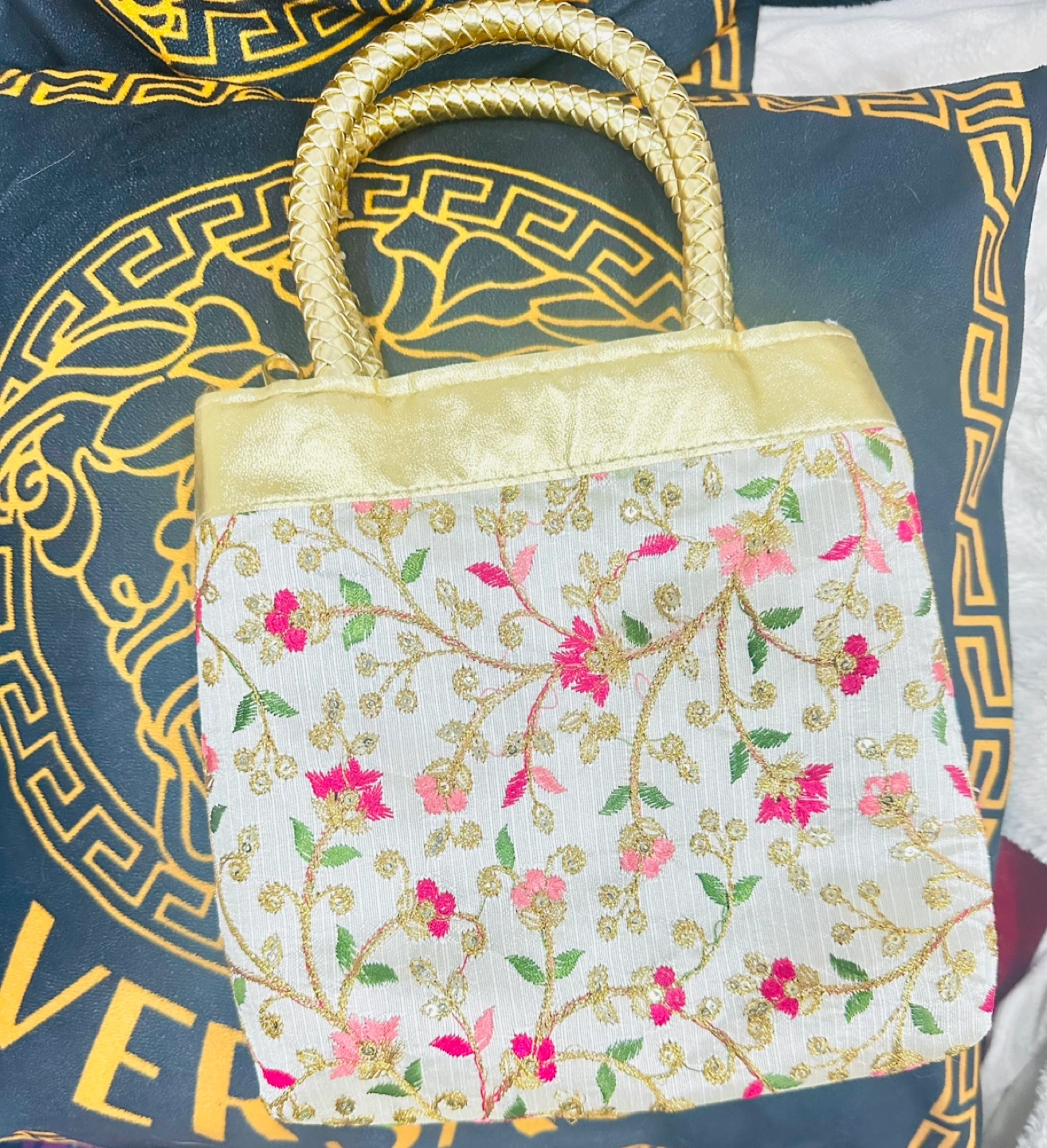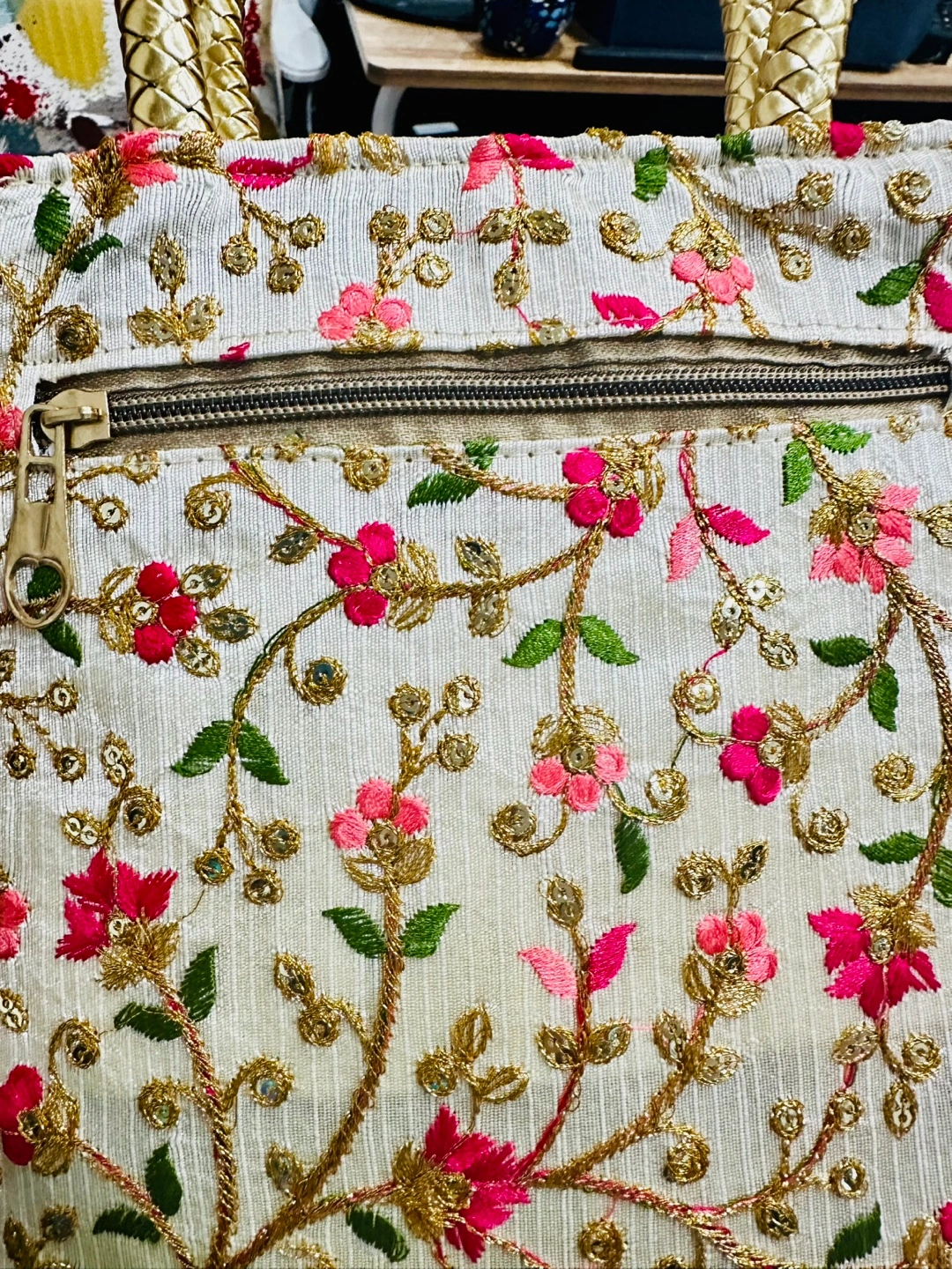 Small embroidered party Evening handbag. Features floral pattern, gold accents, sequins and woven handles. Zip closure. Ideal for evenings out or special occasions.