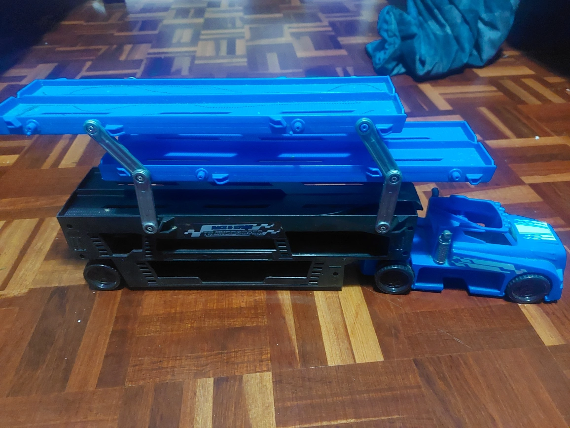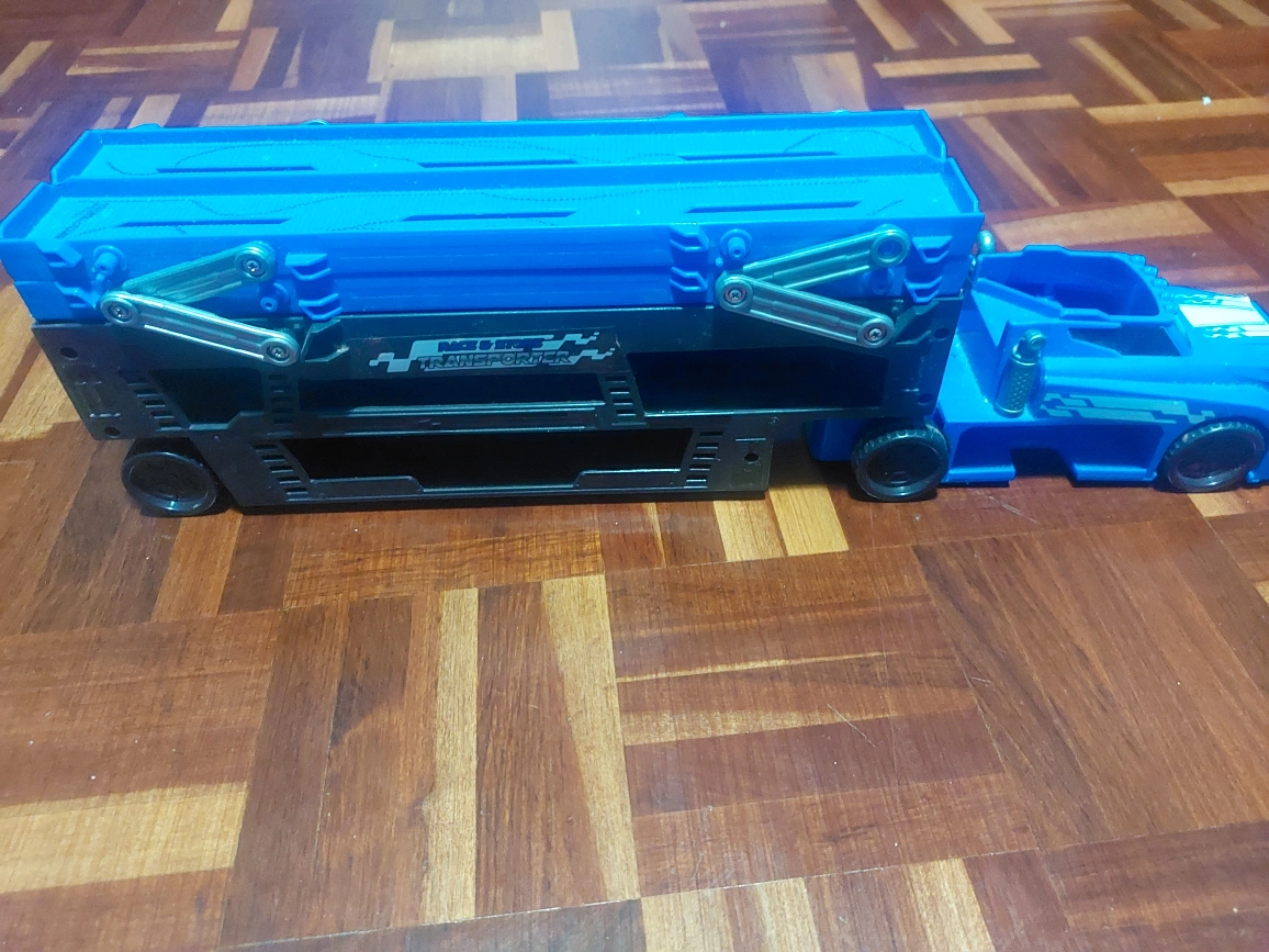 Blue and black toy transporter truck. Two-level carrier. Features movable ramps. Great for kids.