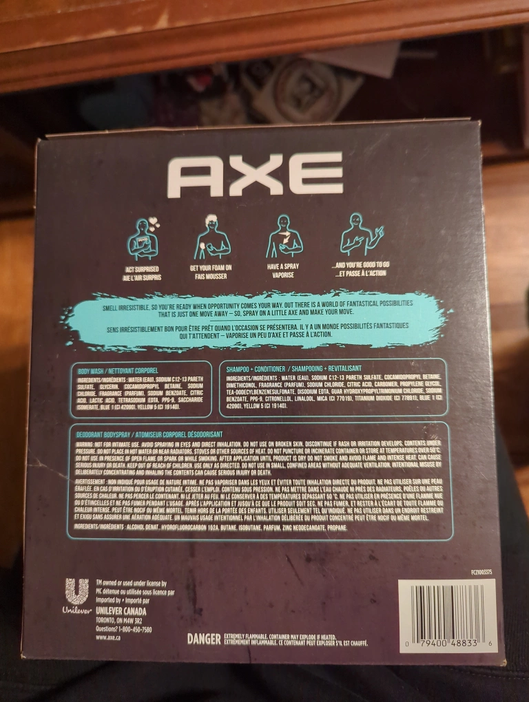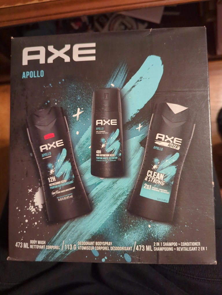New, unopened Axe Apollo gift set. Includes body wash, deodorant bodyspray, and 2-in-1 shampoo + conditioner. Great gift!