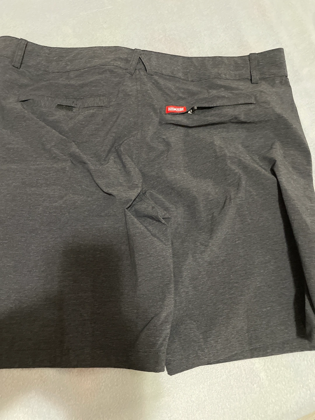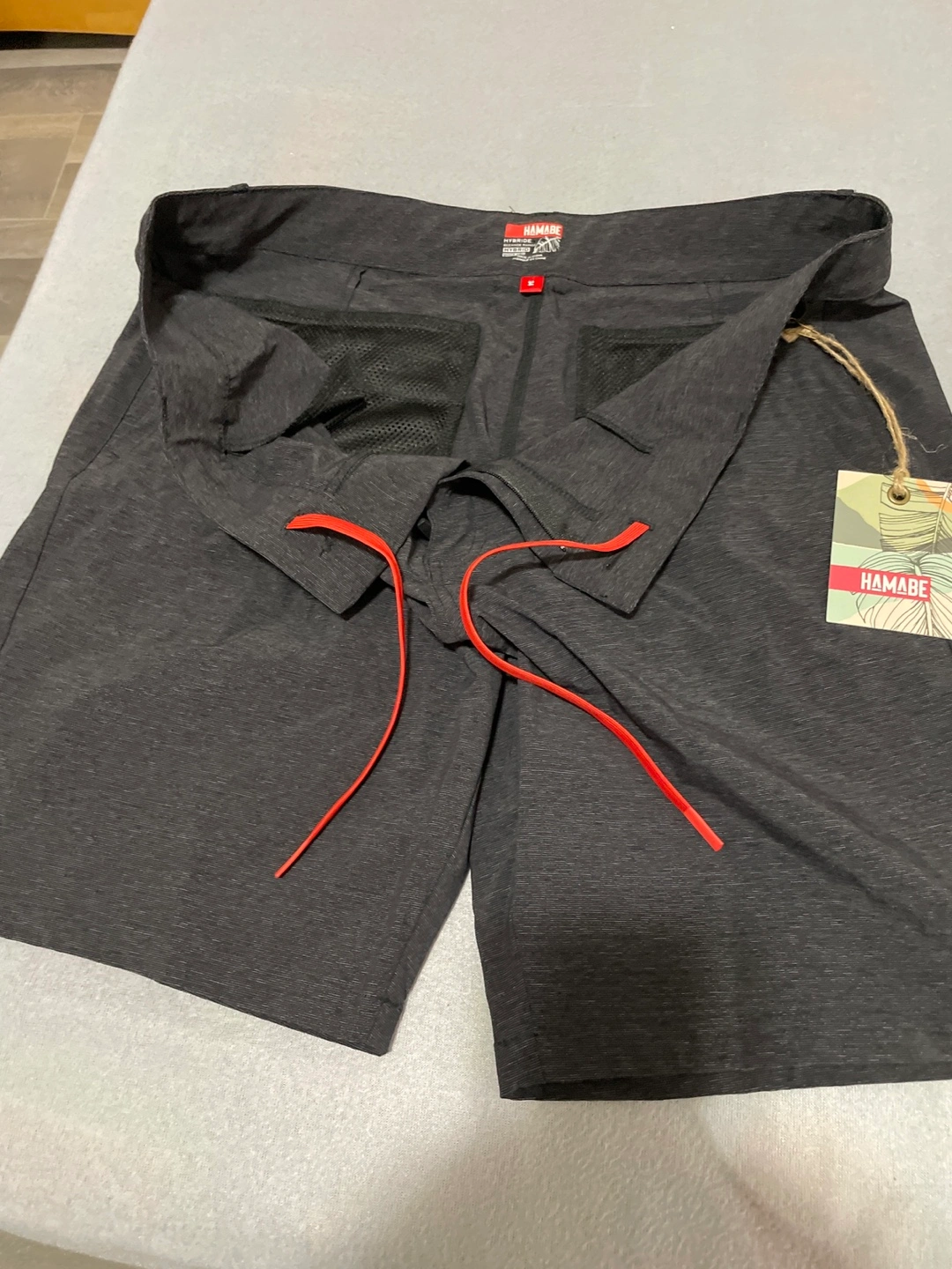 Men's size 34 Hamabe hybrid boardshorts. Dark grey. Features include zippered back pocket and mesh inner lining. New with tags. Original price tag was $65