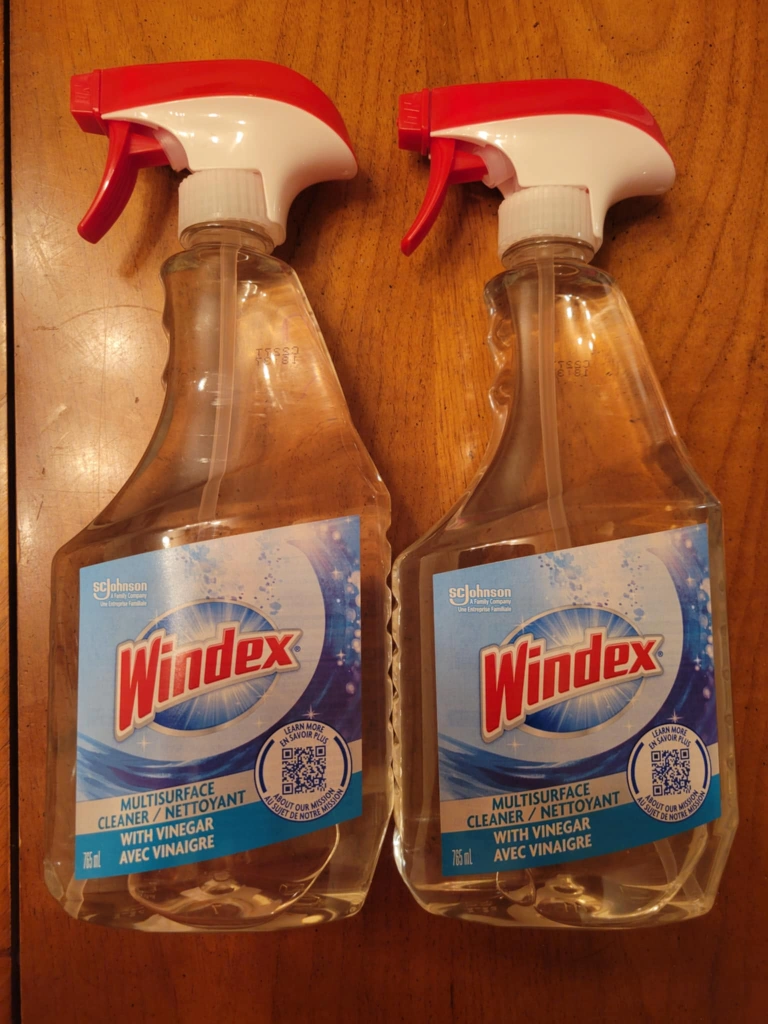 Two bottles of Windex multisurface cleaner with vinegar. 755 ml each. New, unused bottles.