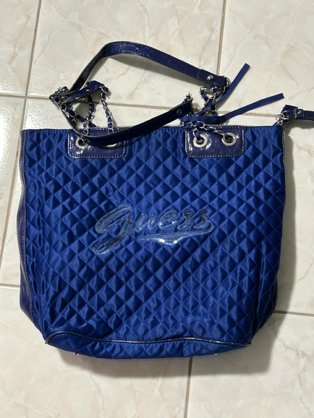 Blue quilted tote bag. Features a chain and leather strap. Embroidered Guess logo. Zipper closure.