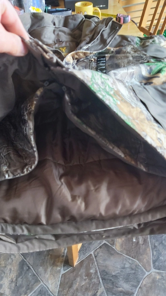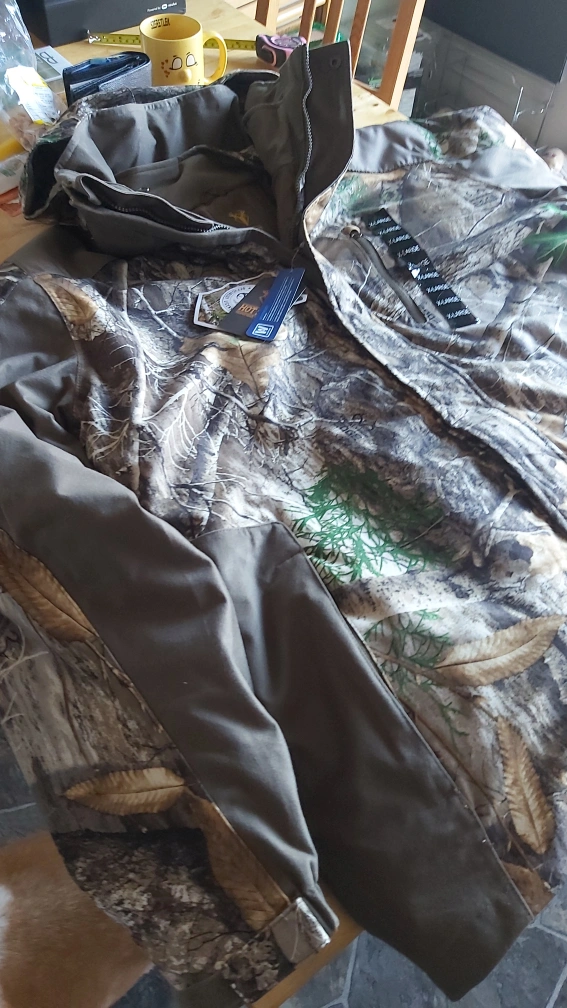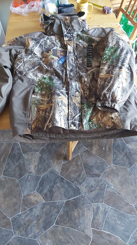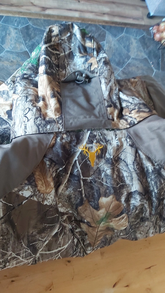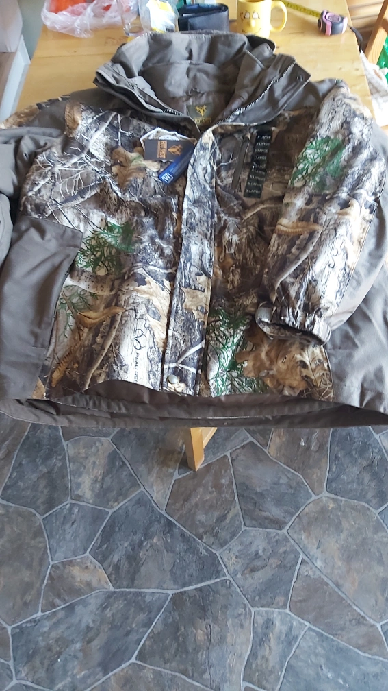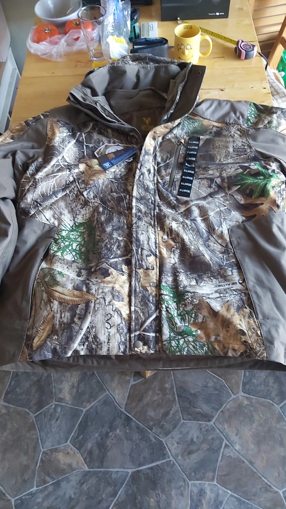 Realtree Xtra camouflage jacket. Size XL. Insulated. Features a hood and multiple pockets. Excellent for hunting or outdoor activities.