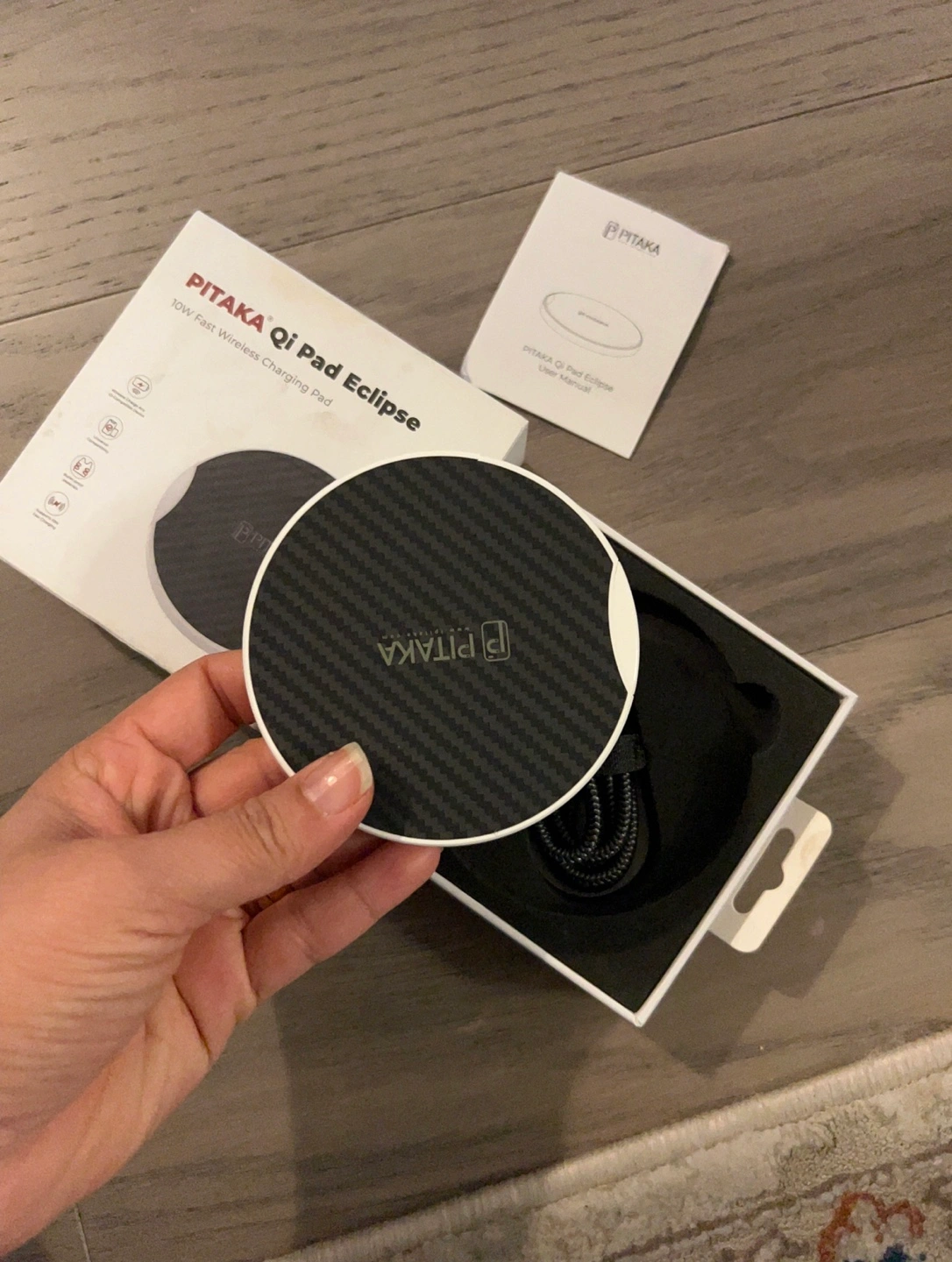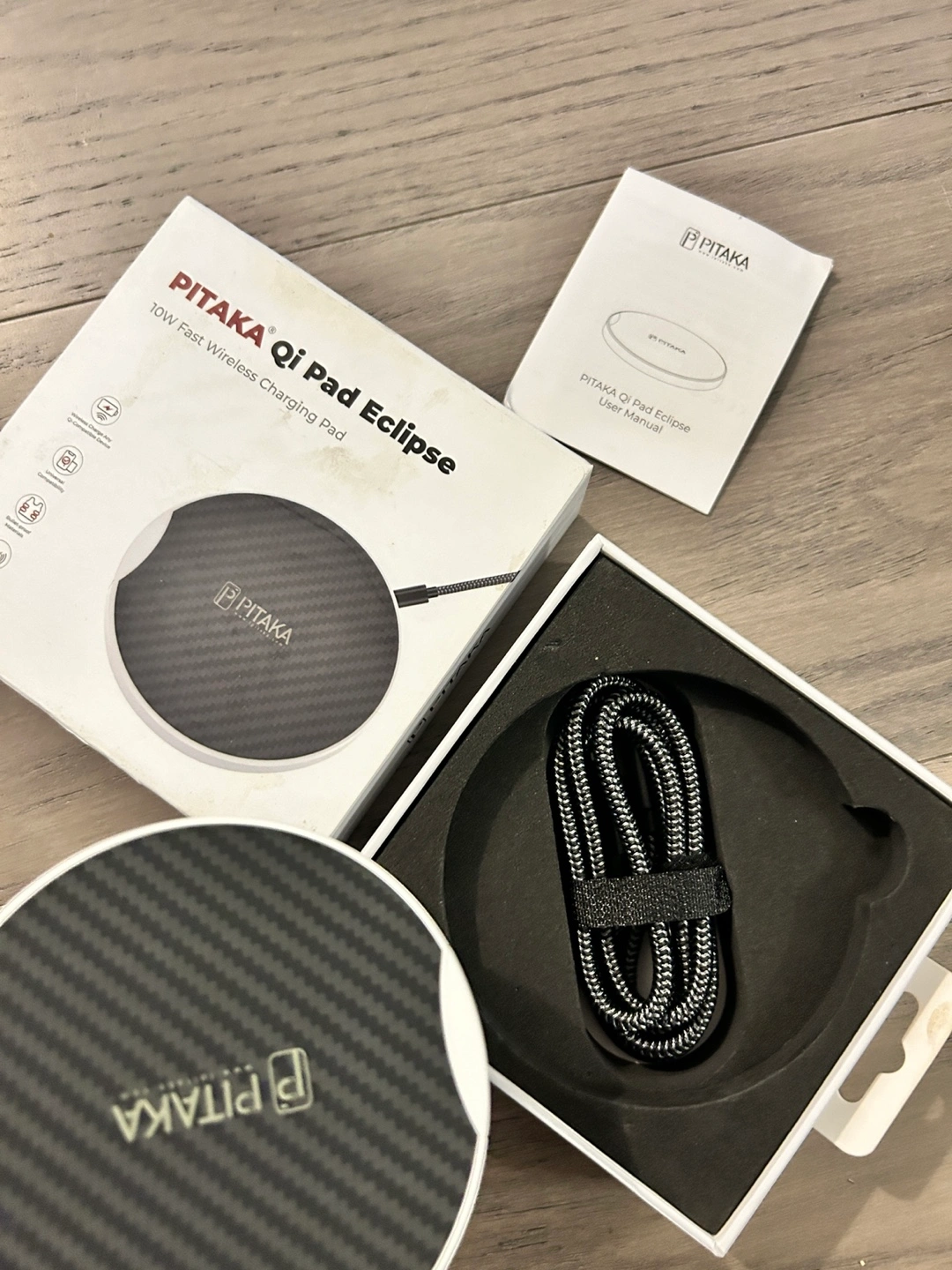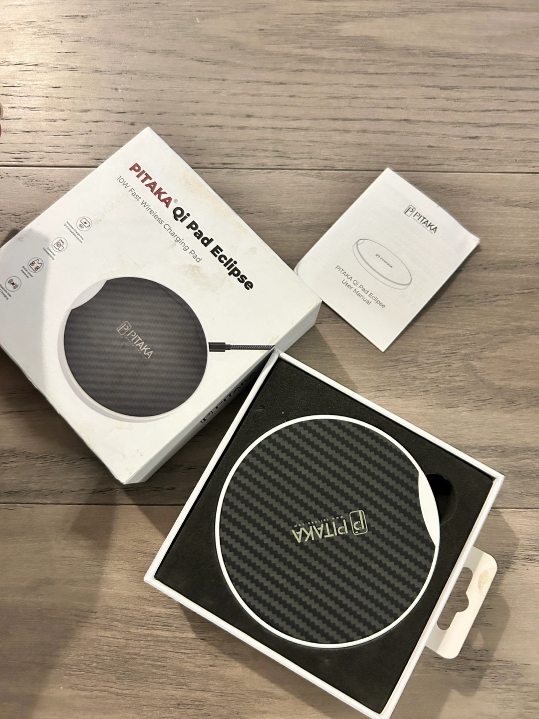New Pitaka Qi Pad Eclipse. 10W fast wireless charging pad. Includes charging cable and user manual. Sleek design, carbon fibre finish. New in box!