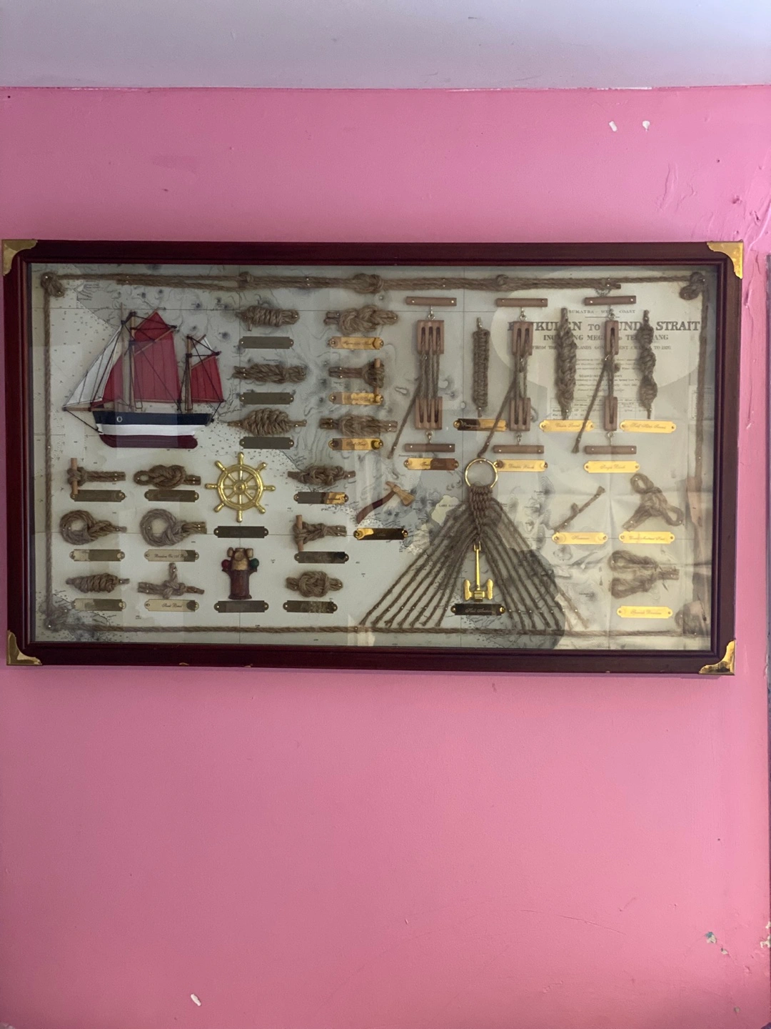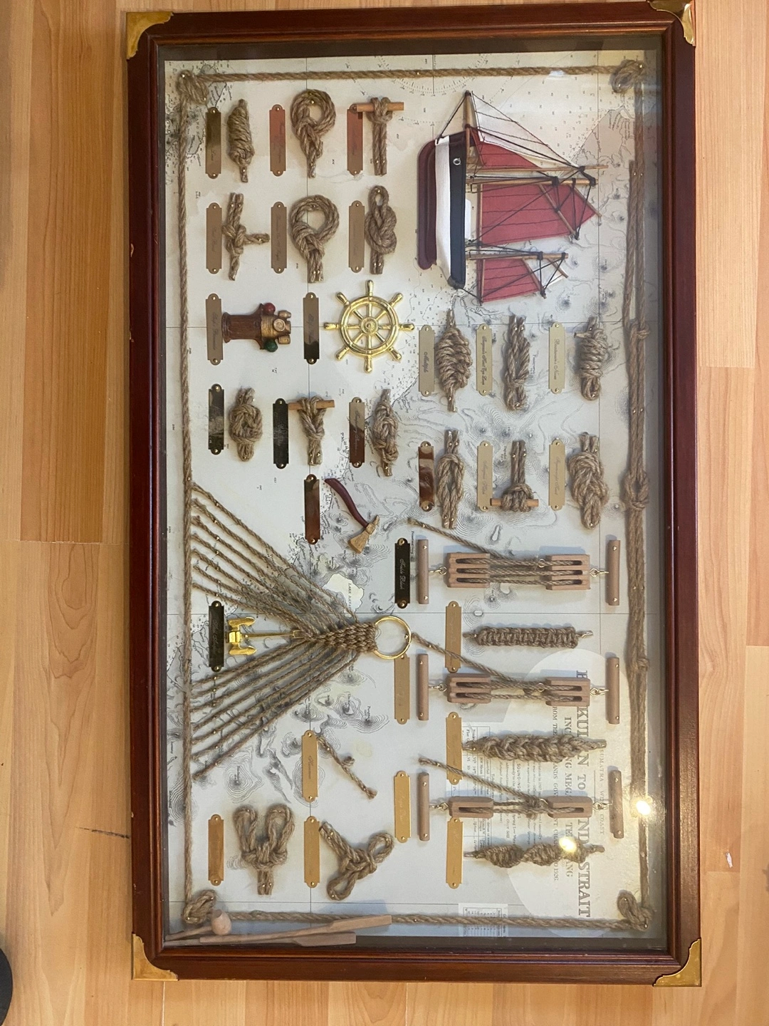 The picture of the ocean knot is framed with a lacquered wooden frame, its corners are protected by gold-plated brass, and equipped with protective glass. It has more than 25 knots engraved on the gold plaque. Size, height: 72 cm, width: 42cm. Bottom: 3.5 cm