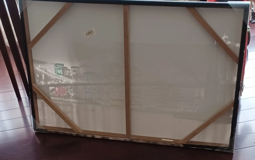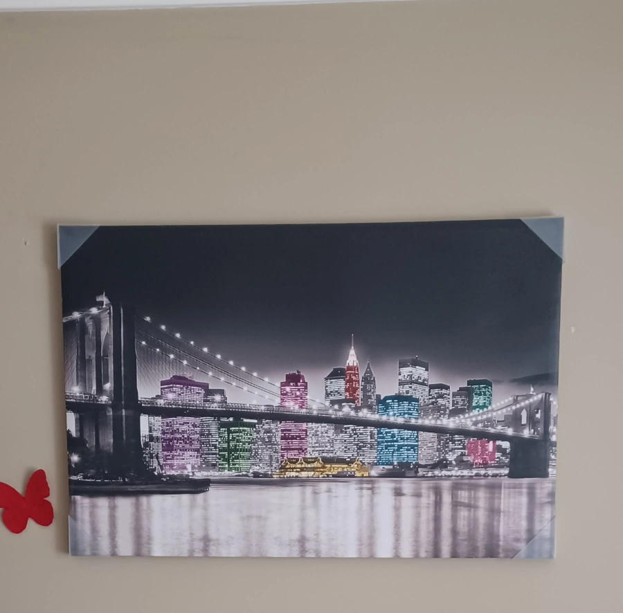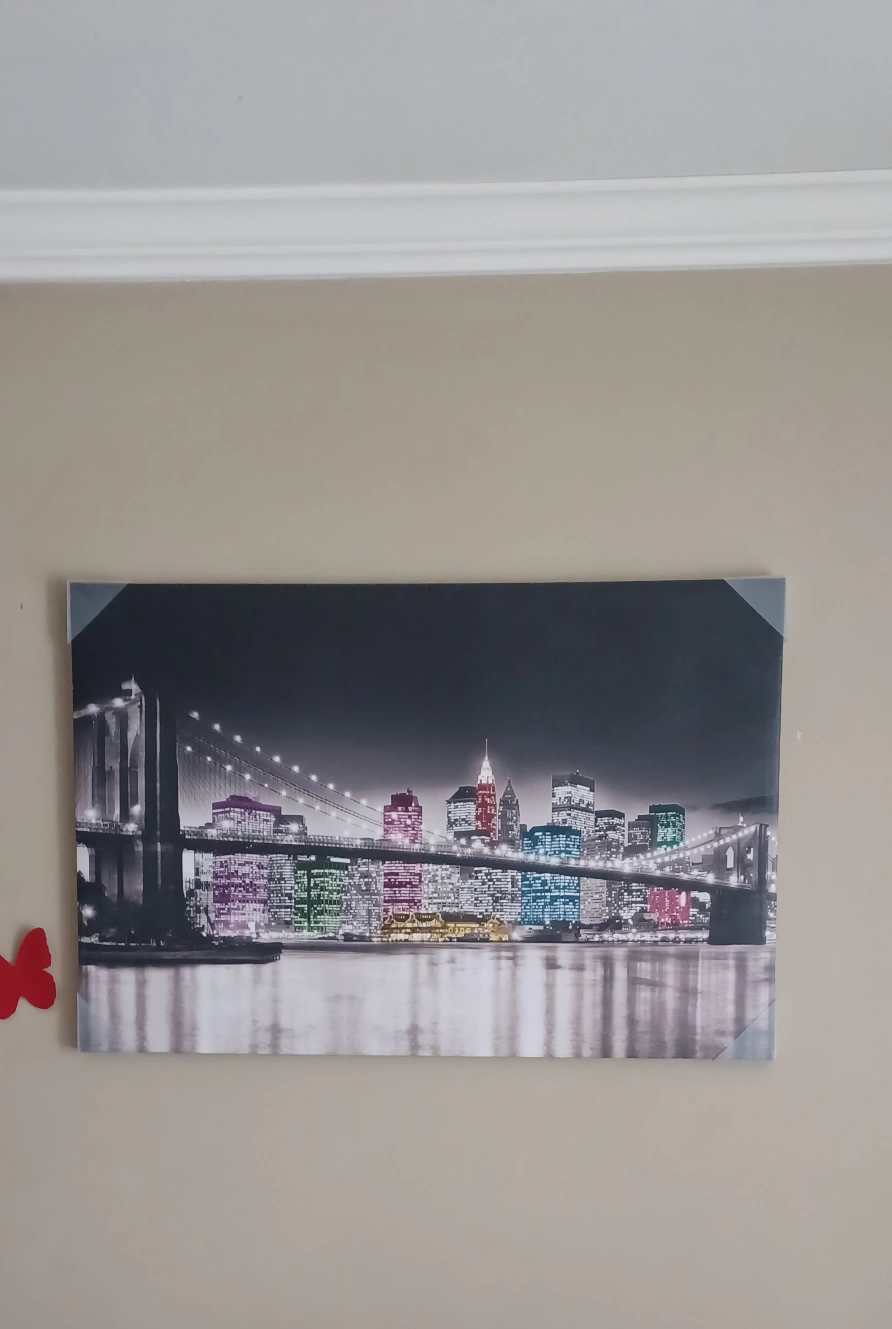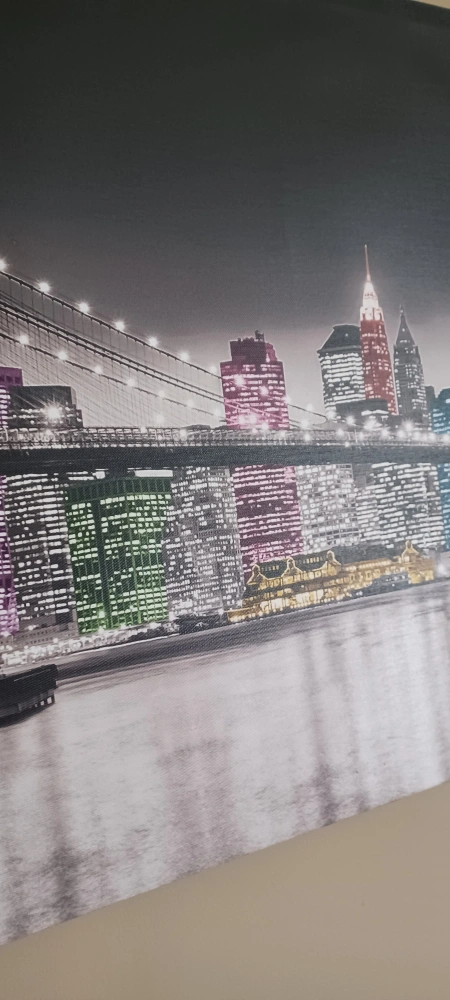 Large canvas print. Features the Brooklyn Bridge at night. Bright colours against a black and white background. Image by Inigo Cia/Getty Images. Made in Mexico. dimension 36"×24.5"