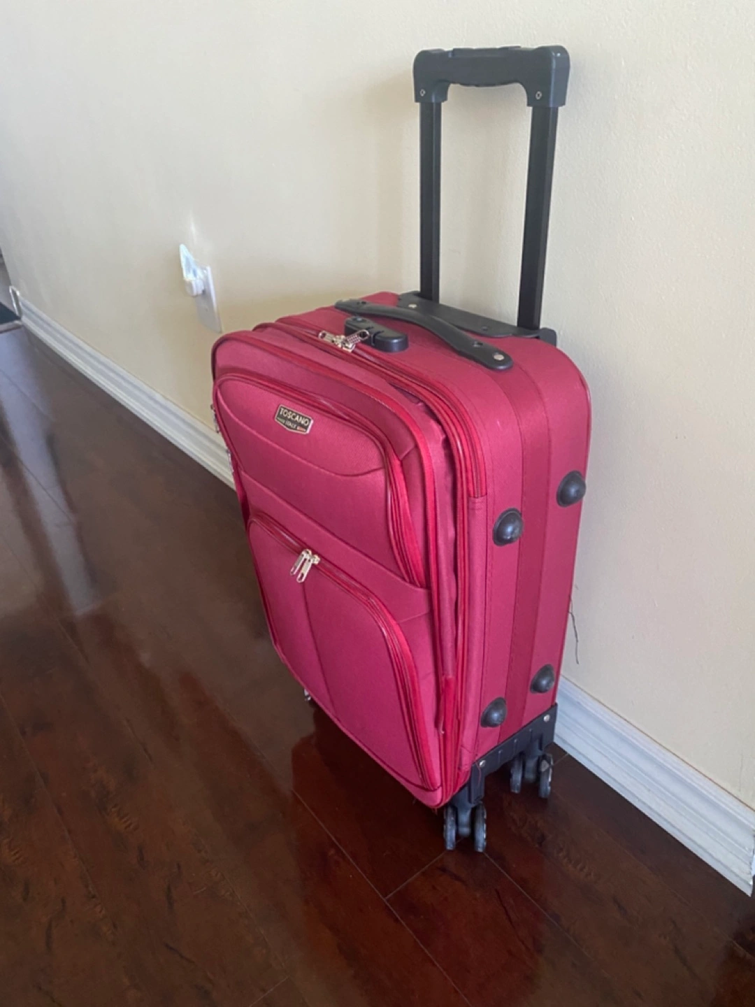 Rolling suitcase. Burgundy colour. Multiple compartments. Telescopic handle. Four spinner wheels. TSA approved combination lock.