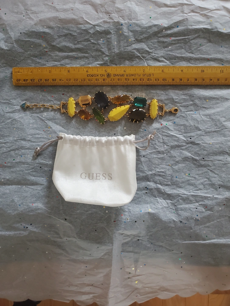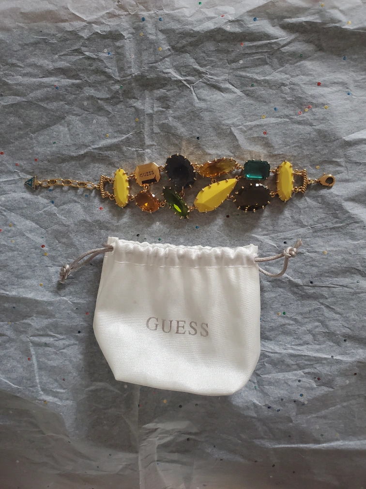 Gorgeous Guess bracelet. Features various coloured stones. Gold-toned chain. Comes with original bag.