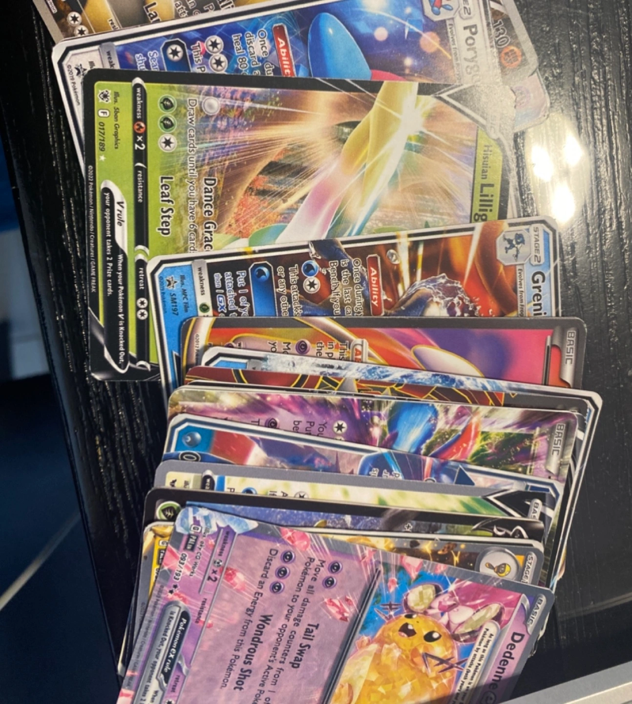 Collection of Pokemon cards. Features various Pokemon and card types. Includes basic and evolved Pokemon.