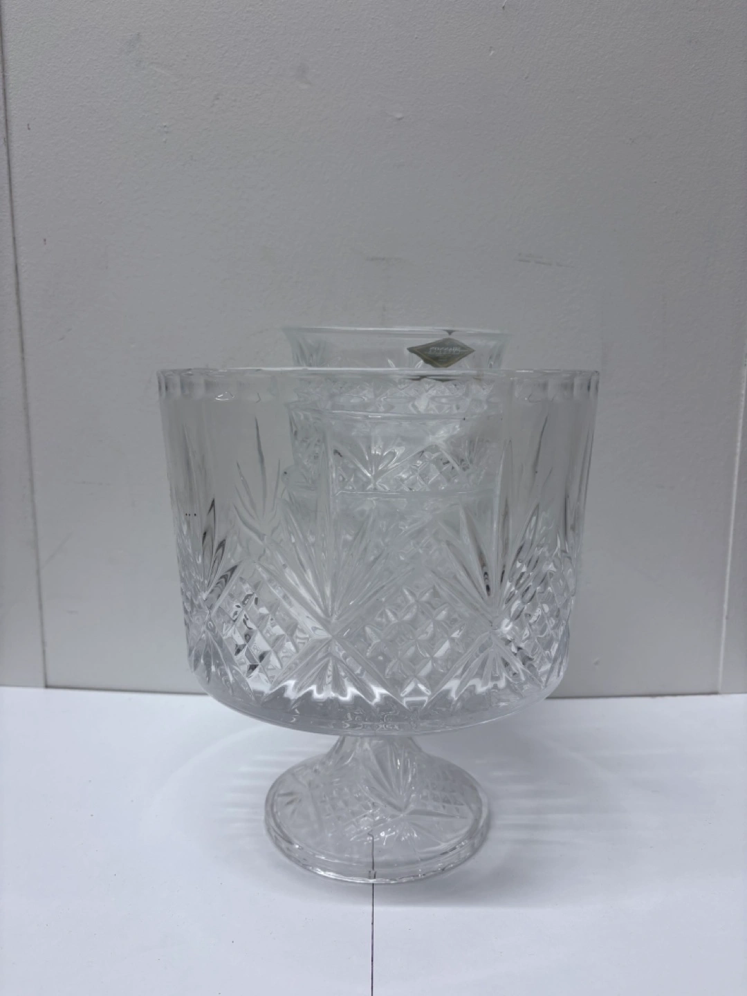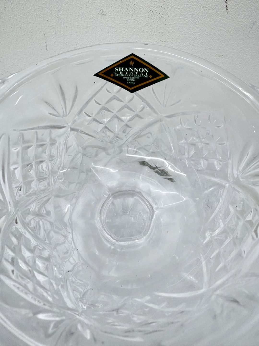 Shannon Crystal pedestal bowl, designed in Ireland and handcrafted in China. Features a beautifully cut glass design with timeless appeal. The set includes one large footed bowl and four coordinating goblets—perfect for entertaining or showcasing on your bar cart! • Brand: Shannon Crystal • Material: Cut glass / crystal • Includes: 1 large pedestal bowl + 4 matching goblets • Condition: Excellent, no chips or cracks • Ideal for punch, desserts, floral centerpieces, or serving